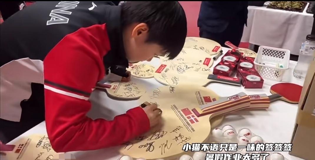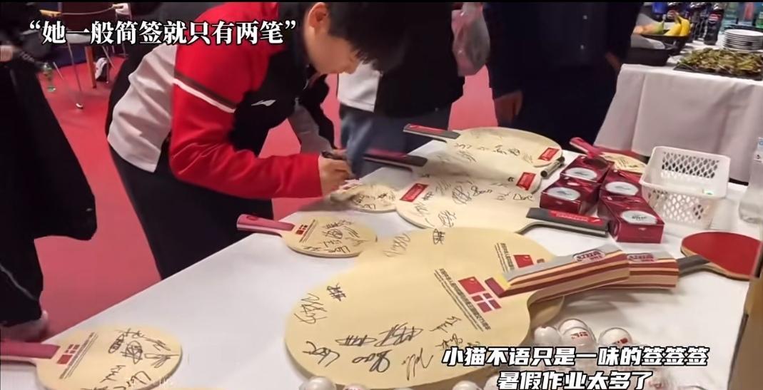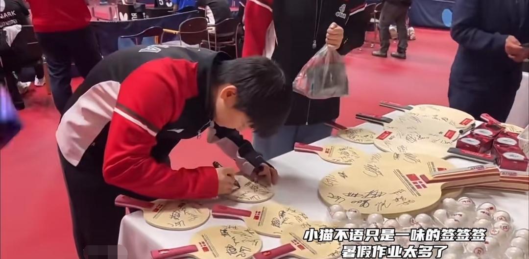 莎莎趴在一堆乒乓球拍子上疯狂签名,笔都快擦出火星子来了。 像不像暑假后期,疯狂