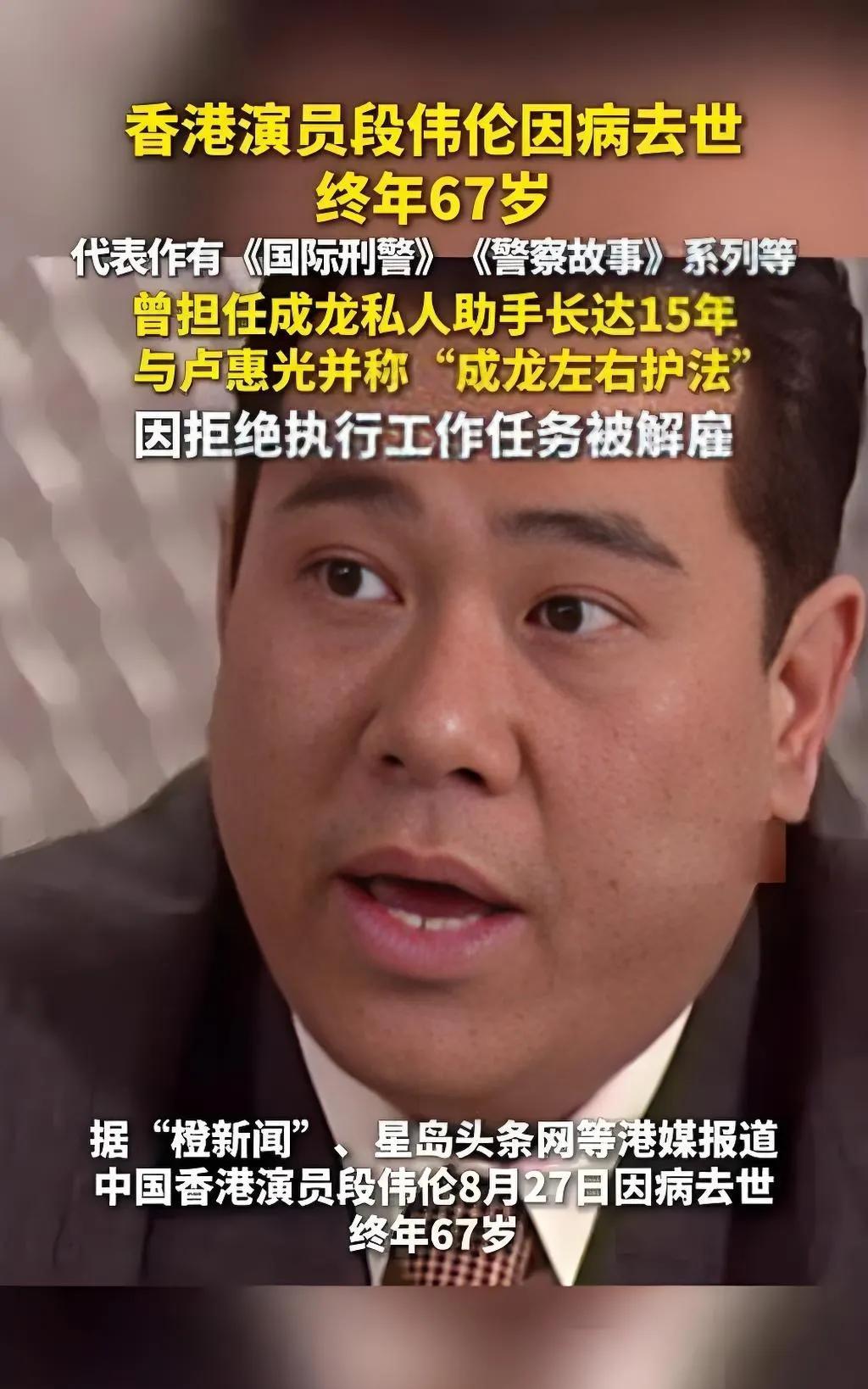 2025年8月27日,中国香港演员段伟伦因病离世,终年67岁,死因疑为肾衰竭。其好友卢惠光证实了这一消息。段伟伦1970年入行,曾出演《警察故事》系列等作品,还担任成龙助手长达15年,后因待遇问题与成龙不欢而散。#段伟光# #段伟# #段洪伟# #段大伟# #卢伟杰#