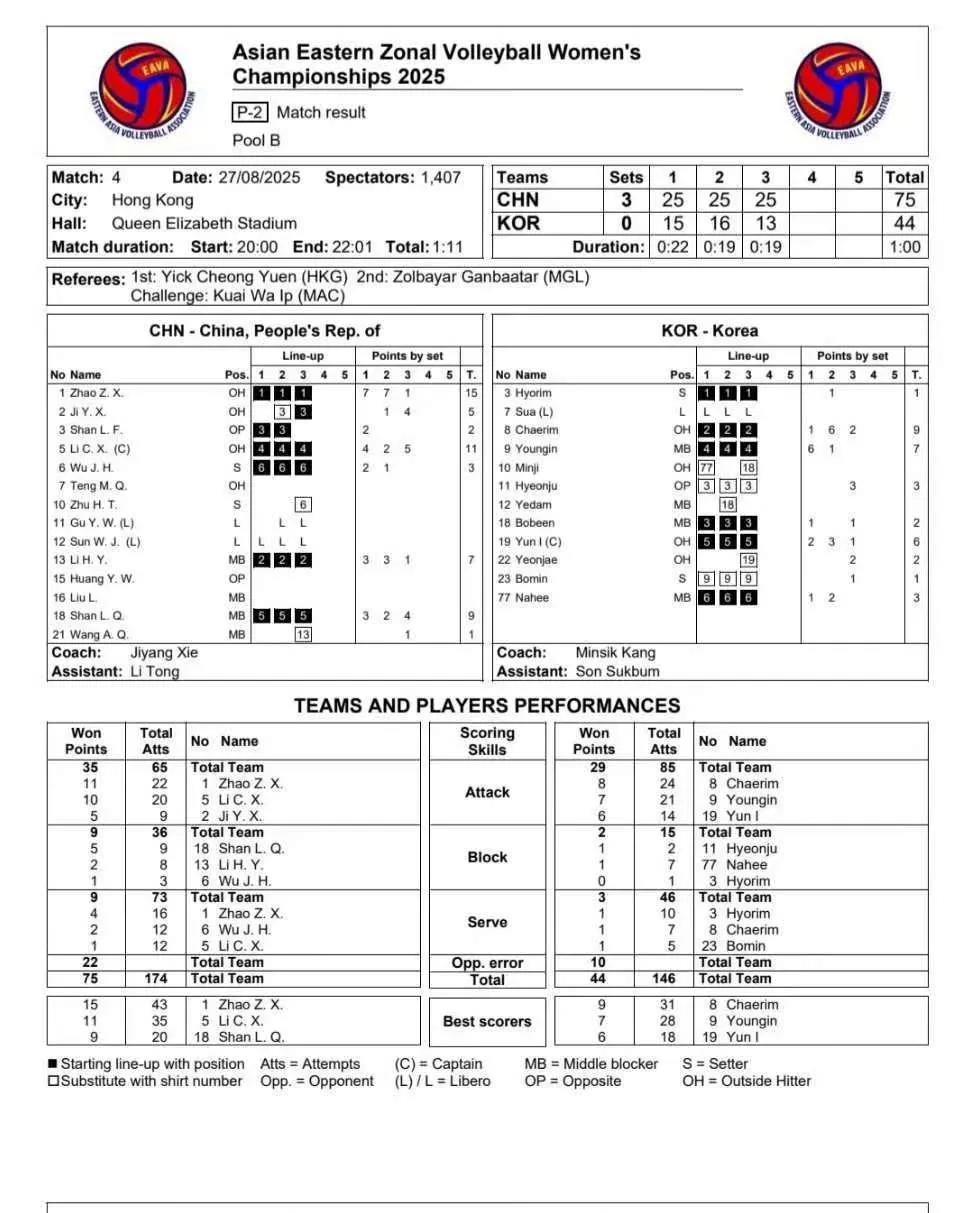 中国女排东亚锦标赛3-0横扫韩国,朱航霆和王奥芊皆已沦为替补。在香港举办的亚洲东区女排锦标赛中,由U21国青队出战的中国队3-0轻取韩国队,三局比分为25-15、25-16、25-13。其中,赵哲熙15分,李晨萱11分,单琳倩9分,李涵宇7分,替补单兰沣的季雨潇5分。本场比赛依然采取快速多变的技战术打法,吴佳慧占据主力二传,而朱航霆及国家队集训副攻王奥芊仅仅在第三局有替补出场发球。其实这批国青队球员身体条件都比较出色,甚至李晨萱、朱航霆、王奥芊还被认为是国家队“遗珠”。但是在U21世锦赛的淘汰赛中都没有力挽狂澜的表现,主打小组赛后三场的朱航霆甚至在1/4淘汰赛后再次沦为替补,连东亚赛面对韩国队也已无缘首发。她们都有不错的天赋和条件,还需要继续进步。