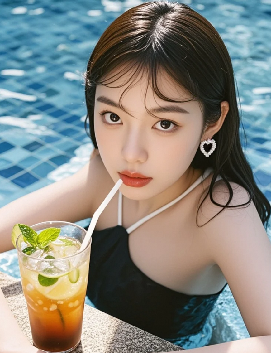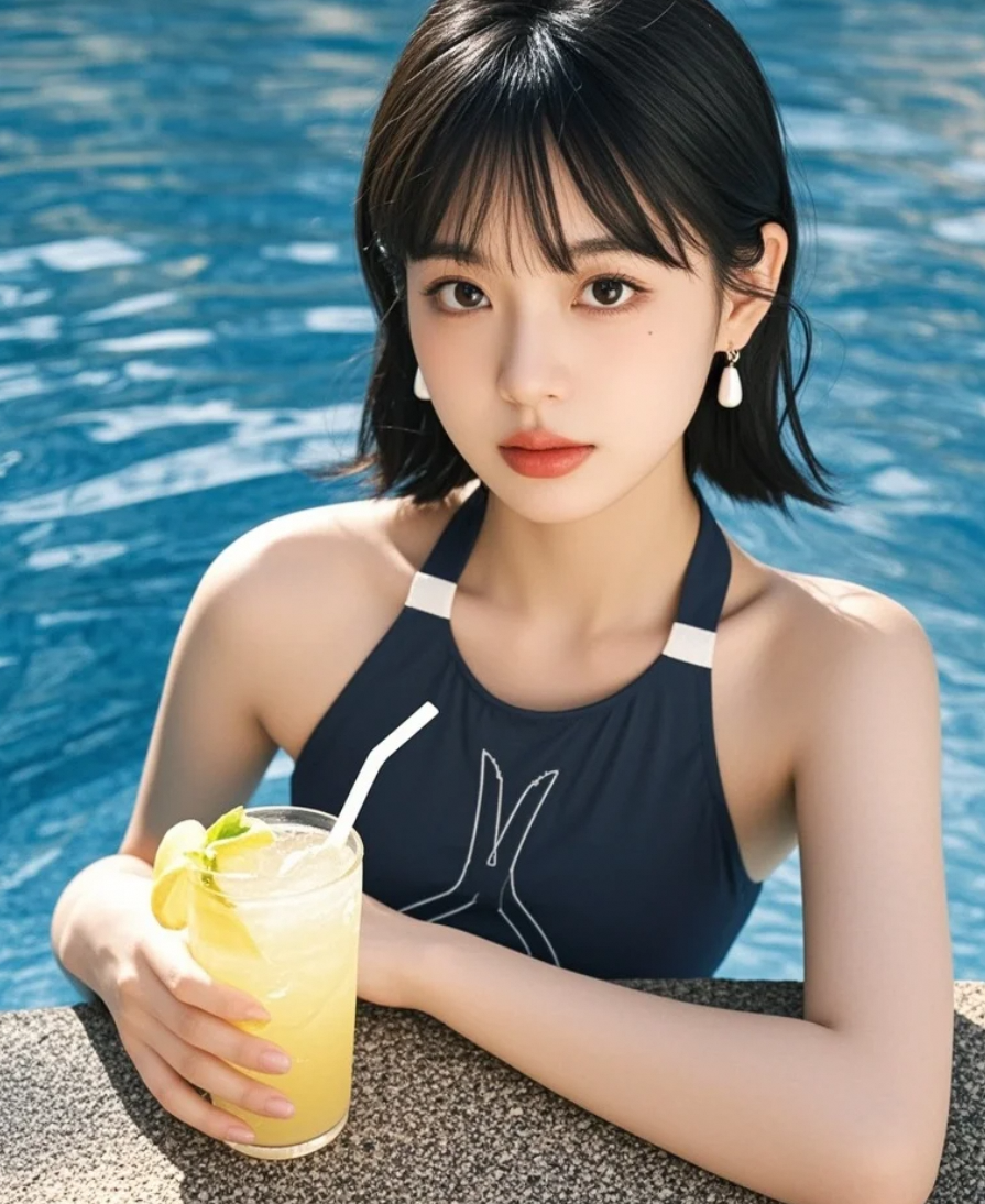 泳池佳人豹纹裁作玉人身,卧水临波态转新。发若流云轻覆水,眸如星斗暗通神。一