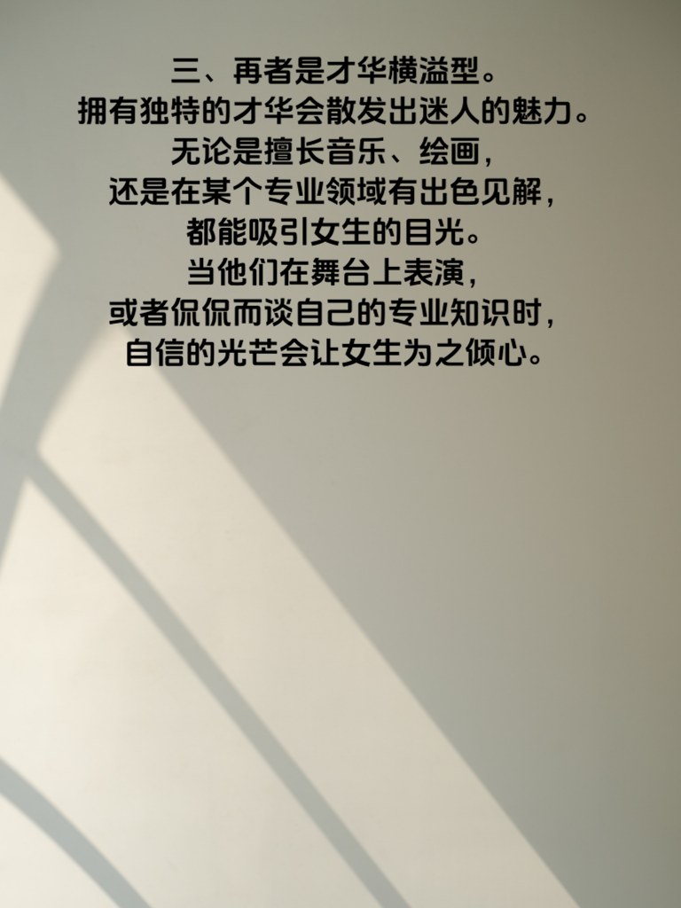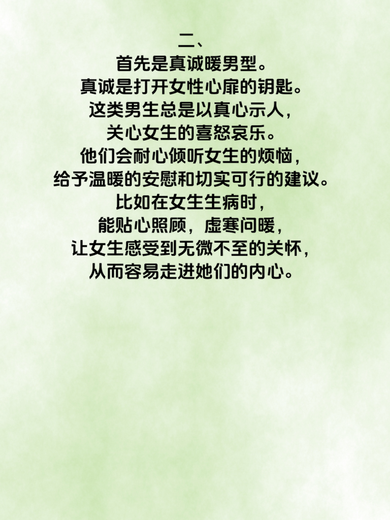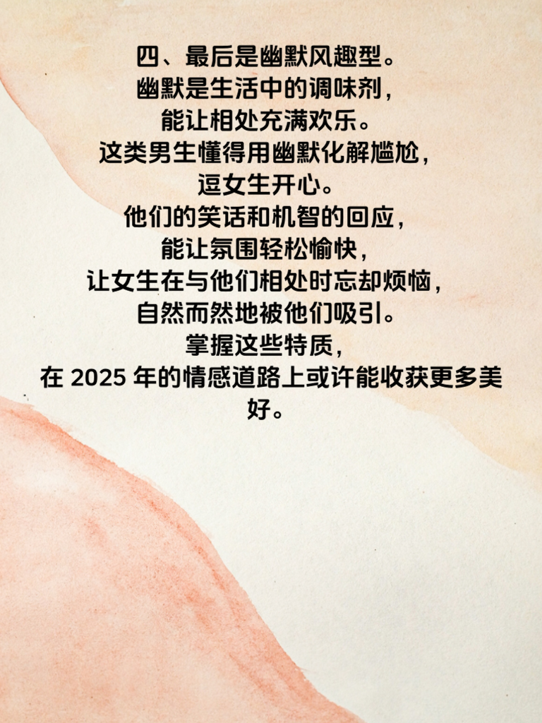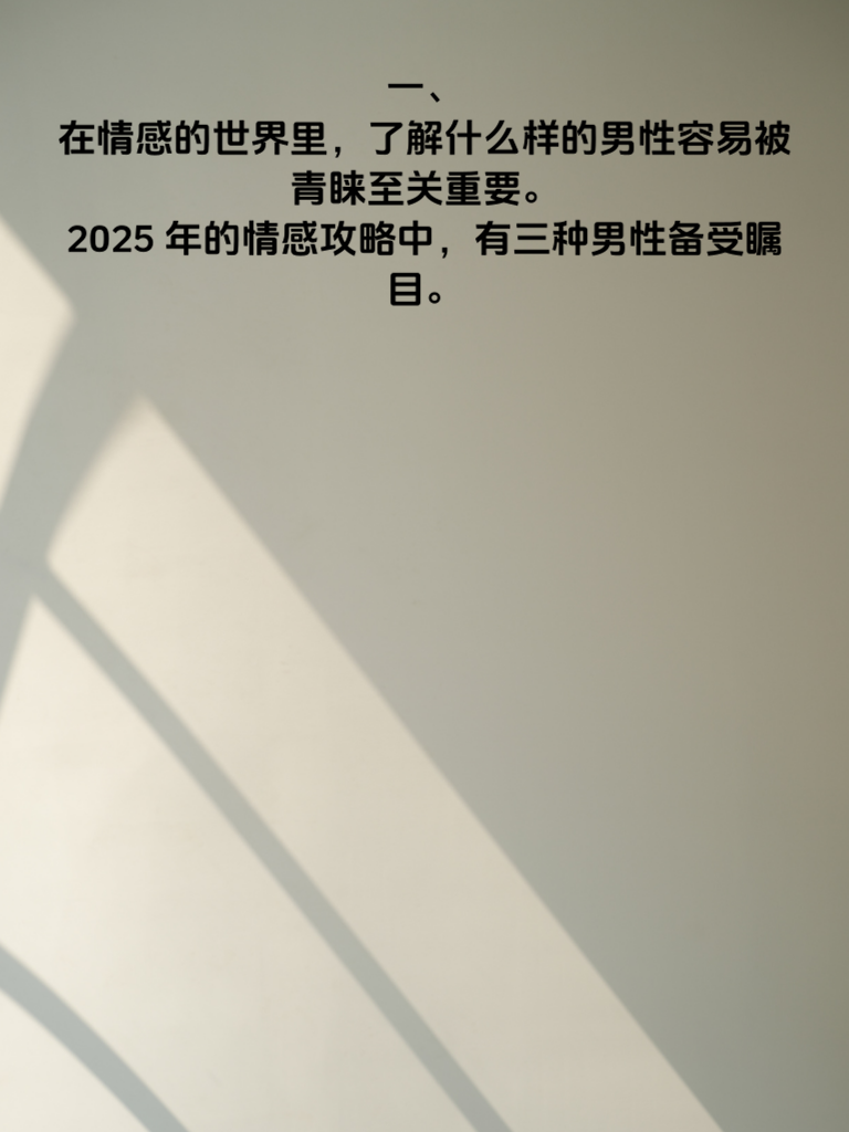 一、在情感的世界里,了解什么样的男性容易被青睐至关重要。2025 年的情感攻略中,有三种男性备受瞩目。 二、首先是真诚暖男型。真诚是打开女性心扉的钥匙。这类男生总是以真心示人,关心女生的喜怒哀乐。他们会耐心倾听女生的烦恼,给予温暖的安慰和切实可行的建议。比如在女生生病时,能贴心照顾,虚寒问暖,让女生感受到无微不至的关怀,从而容易走进她们的内心。 三、再者是才华横溢型。拥有独特的才华会散发出迷人的魅力。无论是擅长音乐、绘画,还是在某个专业领域有出色见解,都能吸引女生的目光。当他们在舞台上表演,或者侃侃而谈自己的专业知识时,自信的光芒会让女生为之倾心。 四、最后是幽默风趣型。幽默是生活中的调味剂,能让相处充满欢乐。这类男生懂得用幽默化解尴尬,逗女生开心。他们的笑话和机智的回应,能让氛围轻松愉快,让女生在与他们相处时忘却烦恼,自然而然地被他们吸引。掌握这些特质,在 2025 年的情感道路上或许能收获更多美好。
