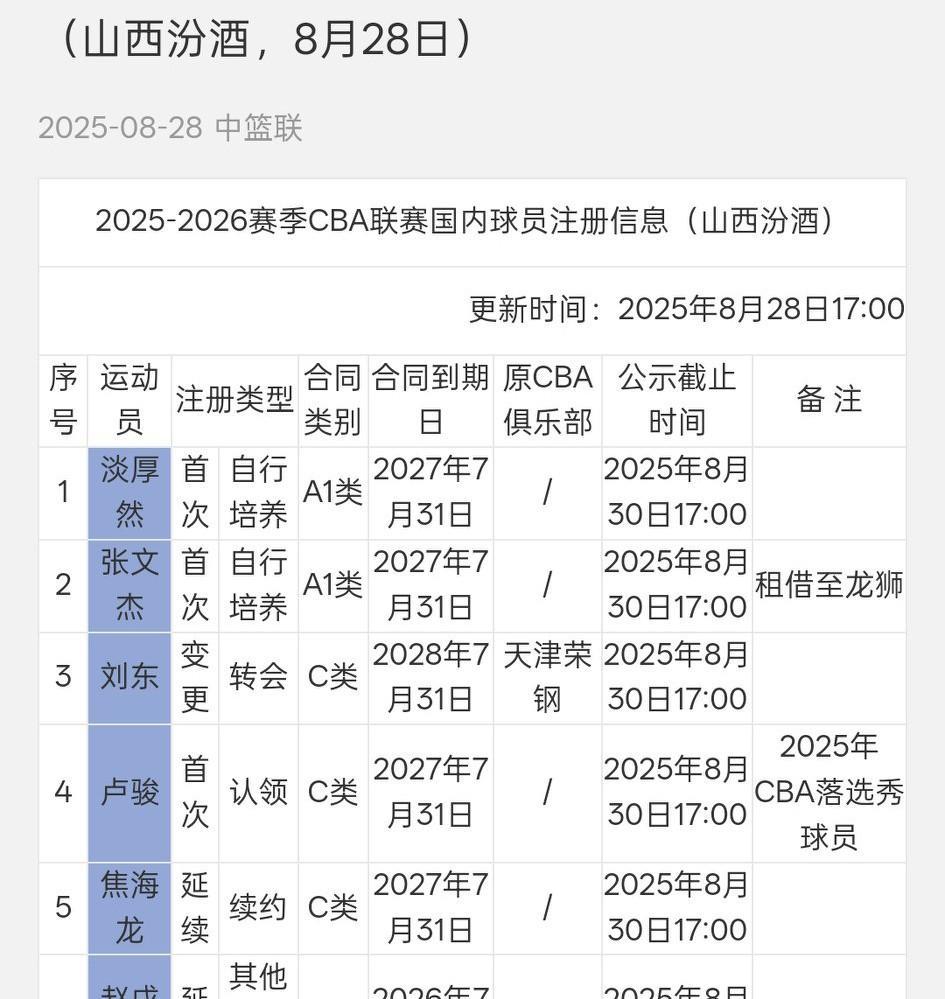 山西汾酒男篮18位本土战神注册到位!淡厚然张文杰刘东焦海龙卢骏赵戌宏补注册,刘冠岑、范汇鎏正式离队! 不出所料,就在本土球员注册还有24小时之际,山西汾酒男篮作为20支球队中的首个球队,已经完成了18位本土球员的注册工作。 备受关注的是,山西汾酒男篮在第一次完成13位球员的注册后,今天又为6位球员进行了注册。分别是:淡厚然两年A类合同,张文杰A类两年合同(租借广州龙狮男篮),刘东C类三年合同,卢骏认领C类两年合同,焦海龙续约C类两年合同。赵戌宏其他联赛返回C类合同一年。 2025-2026赛季,山西汾酒男篮本土球员注册情况如下: 中锋:葛昭宝、刘传兴、淡厚然、马聪、赵戌宏4人。 锋线:焦海龙、刘东、韩霈瑜、何家辰、秦子龙、刘翔龙6人。 2-3号位:张宁、原帅、于米提、张文杰(租借广州龙狮队)4人。 1号位:贾明儒、陈彭宇迪、卢骏3人。 上述18人名单上,刘东、于米提、卢骏、马聪、赵戌宏、淡厚然、张文杰、刘翔龙8人新晋加盟,其中赵戌宏属于离队后二进宫。 除了已经官宣的邢志强解除劳动合同离队外,刘冠岑和范汇鎏自动退出注册。其中范汇鎏大概率会加盟北京北控男篮。取消上赛季注册的宫子轩、焦钟毅二位新人,张文杰租借出去,山西汾酒男篮共有六人离队!