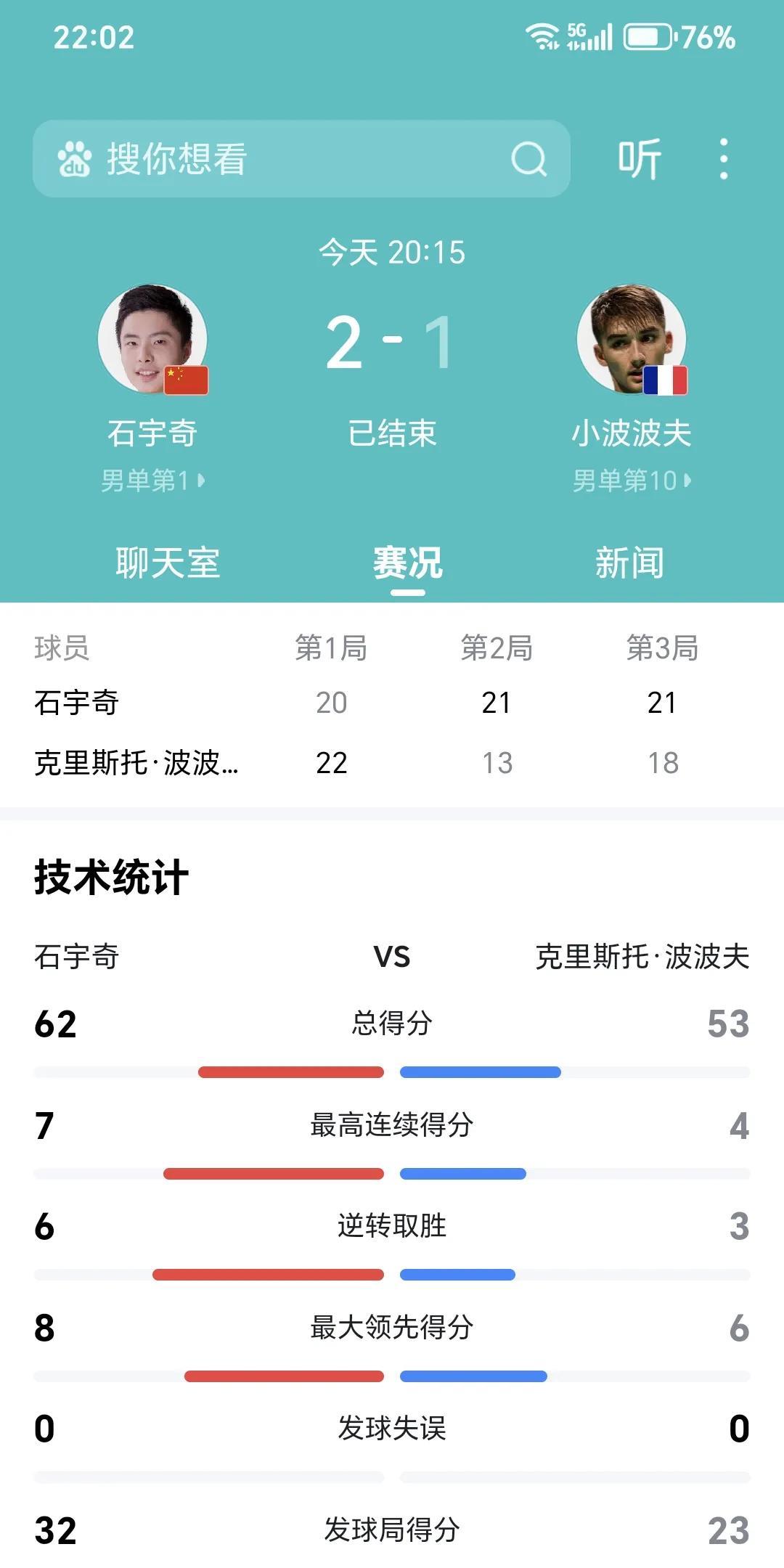 今晚羽毛球世界锦标赛男单第三轮,也就是16进8的比赛中,石宇奇大战法国本土选手小波波夫。 比赛精彩、激烈、刺激、一波三折。 石宇奇作为赛会头号选手,一度被主场作战的小波波夫压制,尤其在决胜的第三局,一度落后5分。但石宇奇表现出强大的心理素质,从来没有急躁过,落后也按照自己的节奏在进行攻防。反观小波波夫,最后阶段太想赢下比赛了,反而失误增多、漏洞变大,被石宇奇抓住机会逆转取胜。 法国的主场还是给石宇奇带来一些影响。 石宇奇现在排名世界第一,这次羽毛球法国世锦赛是石宇奇证明自己的最佳时机。 加油石宇奇,一定要夺冠!夺冠!夺冠!