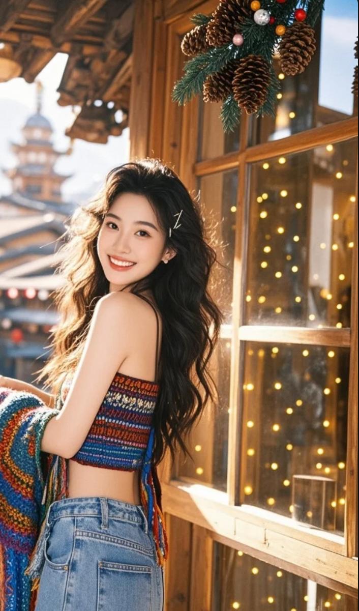 我在木雕喷泉前捧起一束野花与松果 🌼