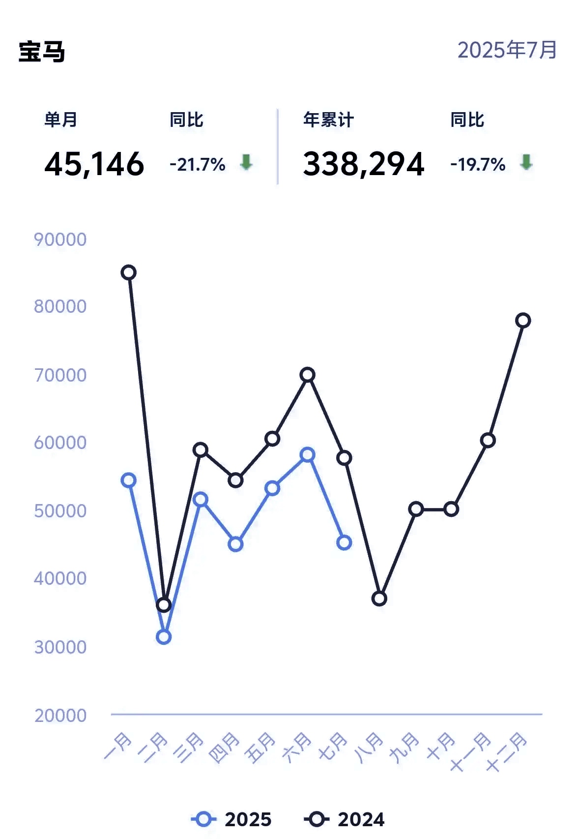 奔驰,7月销量39659,1-7月销量34.00万辆, 宝马,7月销量45146,1-7月销量33.82万辆, 奥迪,7月销量39100,1-7月销量31.97万辆,