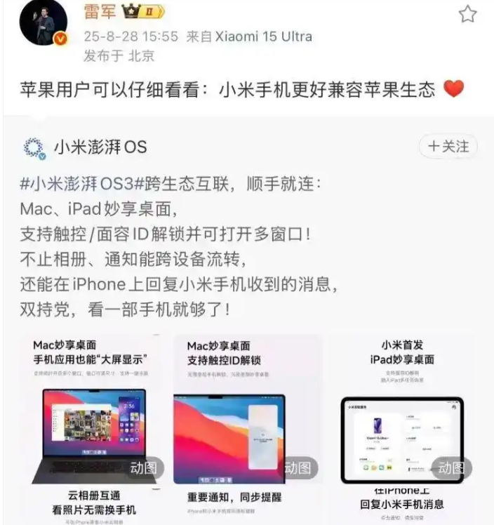 雷军: 我们的系统 支持用苹果回消息!
