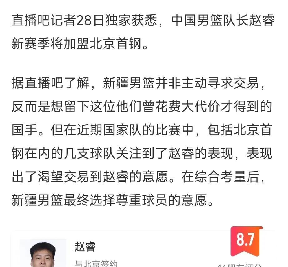 北京男篮新赛季这阵容势必要夺冠啊! 随着赵睿加盟北京首钢,北京也算完成了最后的大