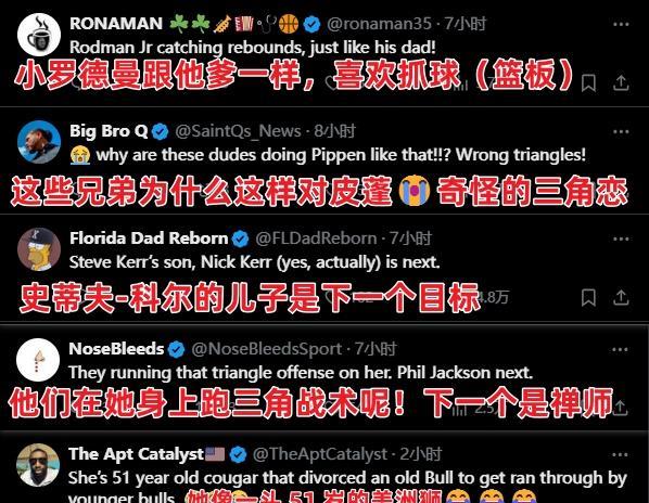 不是!你先等会儿,这信息量有点大!皮蓬前妻拉尔萨在跟罗德曼儿子约会? 拉尔萨先和皮蓬结婚,离婚后和乔丹二儿子约会,分手后,又和罗德曼儿子约会......这圈子这么小吗?美国没男人了? 公牛铁三角: 乔丹:二儿子与拉尔萨热恋,后分手 皮蓬:与拉尔萨结婚,育有3子1女! 罗德曼:儿子与拉尔萨约会.... 更离谱的是,直至今日,拉尔萨还没有改名字,她在所有公开媒体上的全名,都叫拉尔萨-皮蓬! 按照这个路子,当年公牛王朝时期的老人们,现在比较有名望的,就是勇士主教练科尔了。 科尔的儿子叫尼古拉斯-科尔,被科尔放进了勇士教练组,今年32岁,正是年富力强的时候,但他要小心一点了,拉尔萨和罗德曼儿子分手之后,下一个目标没准就是他了。