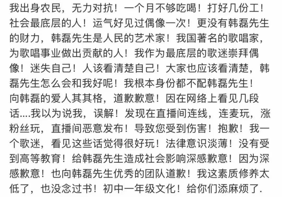 “歌手韩磊出轨多人被曝光”原来只是一个谣言,当事人称自己是底层人员配不上韩磊,韩磊不可能看上自己,还称韩磊先生财力雄厚等,原来只是玩玩。 这才是“造谣”,这才是侵犯名誉权,最反感那些没有“名”的人,整天打着反网暴的旗号,到处打击正常发表评论的网友,看看“名人”韩磊的遭遇才是真正的被伤害。 看这位网友写得道歉信,实话实说,写得真不怎么样?语句不通,意思表达不清,大概就是一个普通人。 如果网上所曝光的事情是真的,相信大家都愿意帮你,但是,如果网上曝光的事情是虚构的,没有根据的,那你就是造谣,韩磊一定会追责的,抓紧时间去道歉吧!