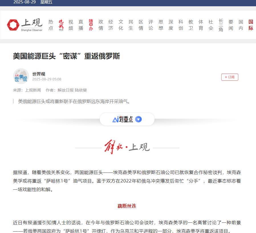 美国能源巨头埃克森美孚前两年刚亏46亿退出俄罗斯,咋现在又偷偷跟俄谈着重返? 一边是之前被“踢出局”的亏空还没补,一边是特朗普一会儿放话“两周内没停火就制裁俄”,一会儿又跟普京说“期待交易”,这反差也太大了! 埃克森美孚这事儿,现在还悬着:前两年亏46亿被俄踢出“萨哈林1号”,现在想回去,就得让俄补这个亏。 可俄说了,要回可以,得帮着解西方制裁——两边都攥着劲,谁也不让谁。 更没谱的是特朗普,前阵儿说“两周内没停火就制裁俄”,转头又跟普京说“期待交易”,他变卦太快,这事儿更没准。 其实美俄都有小九九:美国想借能源逼俄在乌克兰停火,给特朗普凑政绩。 俄想靠这事儿松制裁,让经济喘口气,甚至还聊起买美国设备搞液化天然气。 为了谈成,埃克森美孚还派高管去卡塔尔见俄石油的人——那人是普京亲信还被制裁,美国居然开了绿灯,够重视。 他俩早是老熟人,以前合作过北极项目,2022年才“分手”,私下一直没断联系。 之前阿拉斯加会晤,俩人一见面就提“期待交易”,可特朗普转头就骂印度买俄油,还加了25%关税,双标得很。 说到底,能源看着是生意,其实是大国博弈的牌。但再怎么谈,俄乌冲突不停就白搭——没人愿意在战火边做长期生意。 想靠能源“和解”,最终还得落到和平上,没和平,啥合作都长不了。