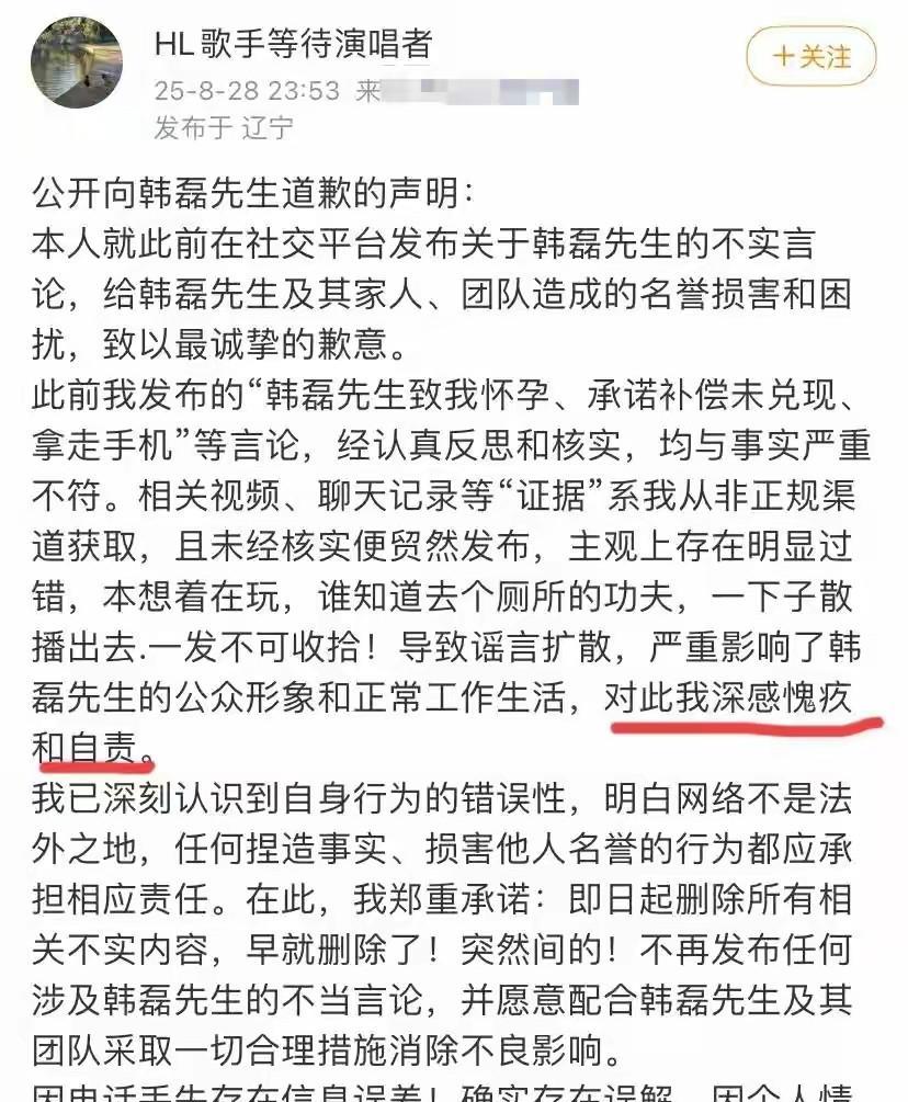 韩磊的瓜尘埃落定!造谣者发长文道歉,竟然将原因归结为自己是没有文化的农民!对于这