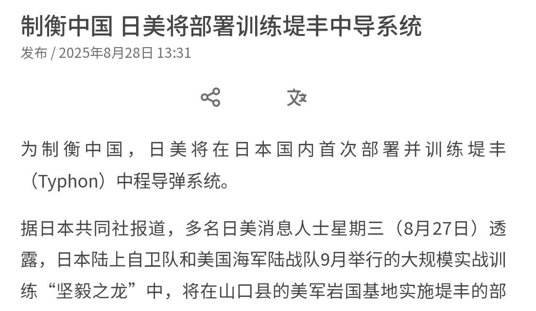 对于我们的警告,日本听不进去!既然日本听不进去警告,我们也应该来硬的了!8月28日,根据外媒报道,在我们警告之后,日本执意配合美国部署堤丰中程导弹系统。多名日美消息人士透露称,日本陆上自卫队和美国海军陆战队9月举行的大规模实战训练“坚毅之龙”中,将在山口县的美军岩国基地实施堤丰的部署训练。 最近这则消息真让人窝火,8月28日外媒报道,咱们已经多次警告,可日本就像没听见一样,铁了心要配合美国在山口县的岩国基地部署堤丰中程导弹系统。 大家可能对这个堤丰系统不太熟熟悉,说白了这就是一套能打很远的导弹发射装置,最厉害的是它能带射程1800公里的战斧导弹。 啥概念?从岩国基地打出来,咱们国家东部沿海从北京到上海,几乎都在它的打击范围里,这就跟在咱们院墙外架了门大炮没两样。 还有那种"标准-6"导弹,虽然射程短点,但400多公里的范围也够覆盖咱们不少沿海城市了,而且既能打飞机又能打军舰,简直就是个多面手。 日本当年签的和平宪法里明明写着不能搞进攻性武器,可这些年他们早就把宪法当摆设了,看看数据就知道,他们的军费一年比一年高,从以前占GDP的1%都不到,涨到现在要奔着2%去了,这哪是搞防御的样子? 这次借着和美国搞训练的名义把堤丰系统弄进来,就是想把自己绑在美国的战车上,一步步突破军事限制,这种小心思咱们看得清清楚楚。 有人可能会说,这不就是一次训练吗?可大家别忘了,美国去年就在菲律宾部署过这套系统,结果把整个南海都搅得不安生。 现在又要把这玩意儿弄到日本来,很明显是想在咱们周边织一张导弹网,东边西边都给你堵上。 美国自己怕担风险,就拉着这些盟友当棋子,而日本呢,正好借着这个机会发展军力,两边各怀鬼胎,可受害的是整个地区的和平稳定。 咱们不是没警告过,从去年美国打算在菲律宾部署堤丰开始,咱们外交部就多次表态反对,可他们就是不听。 这次日本更是把咱们的警告当耳旁风,这种情况下再忍让,只会让他们觉得咱们好欺负,想想历史上,日本军国主义就是靠着不断试探才一步步走上侵略道路的,现在他们又开始在军事上蠢蠢欲动,还跟着美国到处煽风点火,这不得不让人警惕啊。 对付这种情况,光靠嘴巴警告肯定是不够的,必须拿出实际行动来,咱们解放军在南海应对类似挑衅时就做得很到位,你部署导弹,我就加强战备值班;你搞联合军演,我就派航母战斗群搞实战演练。 这次面对日本的挑衅,咱们更得硬气起来,该部署的防御系统得跟上,该进行的军演不能少,让他们看看咱们有足够的能力保卫自己的家园。 可能有人担心这样会激化矛盾,可大家想想,退让从来换不来和平,你越是怕事,他们就越得寸进尺。 美国在菲律宾部署堤丰的时候,咱们就启动了东风导弹的战备值班,还派了轰-6K轰炸机巡航,效果就很好。 对付这种军事挑衅,就得用他们听得懂的语言来回应,你敢把导弹架到我家门口,我就有能力让你的导弹变成废铁。 咱们普通人虽然不用上战场,但也得明白这件事的严重性,日本这么做不光威胁咱们国家的安全,对他们自己也没好处。 一旦真的发生冲突,第一个遭殃的就是那些部署导弹的地方,日本老百姓其实也不傻,谁愿意自家门口放这么危险的东西?只是现在他们的政府被右翼势力带偏了,一门心思要跟着美国对抗中国。 说到底,咱们不想打仗,但也绝不怕打仗,美国和日本想靠着几套导弹系统就吓住咱们,那是打错了算盘。 这些年咱们的国防力量早就今非昔比,航母编队能出海远航,先进导弹能精准打击,任何国家想在中国家门口动武,都得先掂量掂量后果。 看着日本这样一步步突破军事限制,真让人想起几十年前的历史教训,当年就是因为对军国主义的纵容,才导致了那么大的灾难,现在他们又开始走老路,还要拉着美国一起在亚太搞事,这是绝对不能容忍的,咱们必须拿出强硬态度,让他们知道触碰中国底线的代价是什么。 总之,日本不听警告非要部署堤丰系统,那咱们就必须来硬的,你搞军事挑衅,我就加强防御;你拉着美国搞联合训练,我就搞实战化军演。 只有让他们实实在在感受到压力,才能让这些人头脑清醒一点。和平不是求来的,是靠实力捍卫的,咱们有足够的决心和能力,保卫国家的安全和利益,任何想在中国周边生事的人,都别想有好下场。