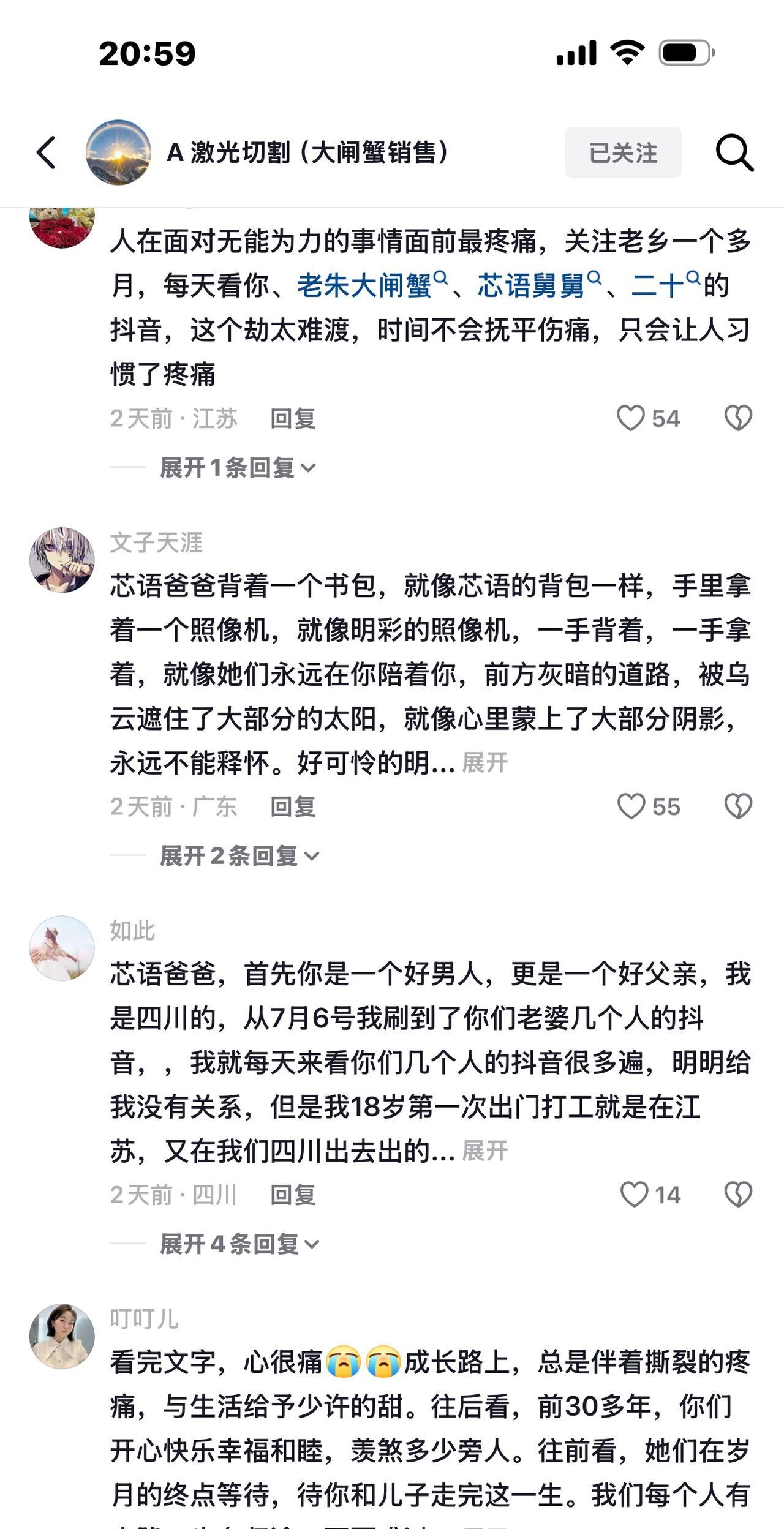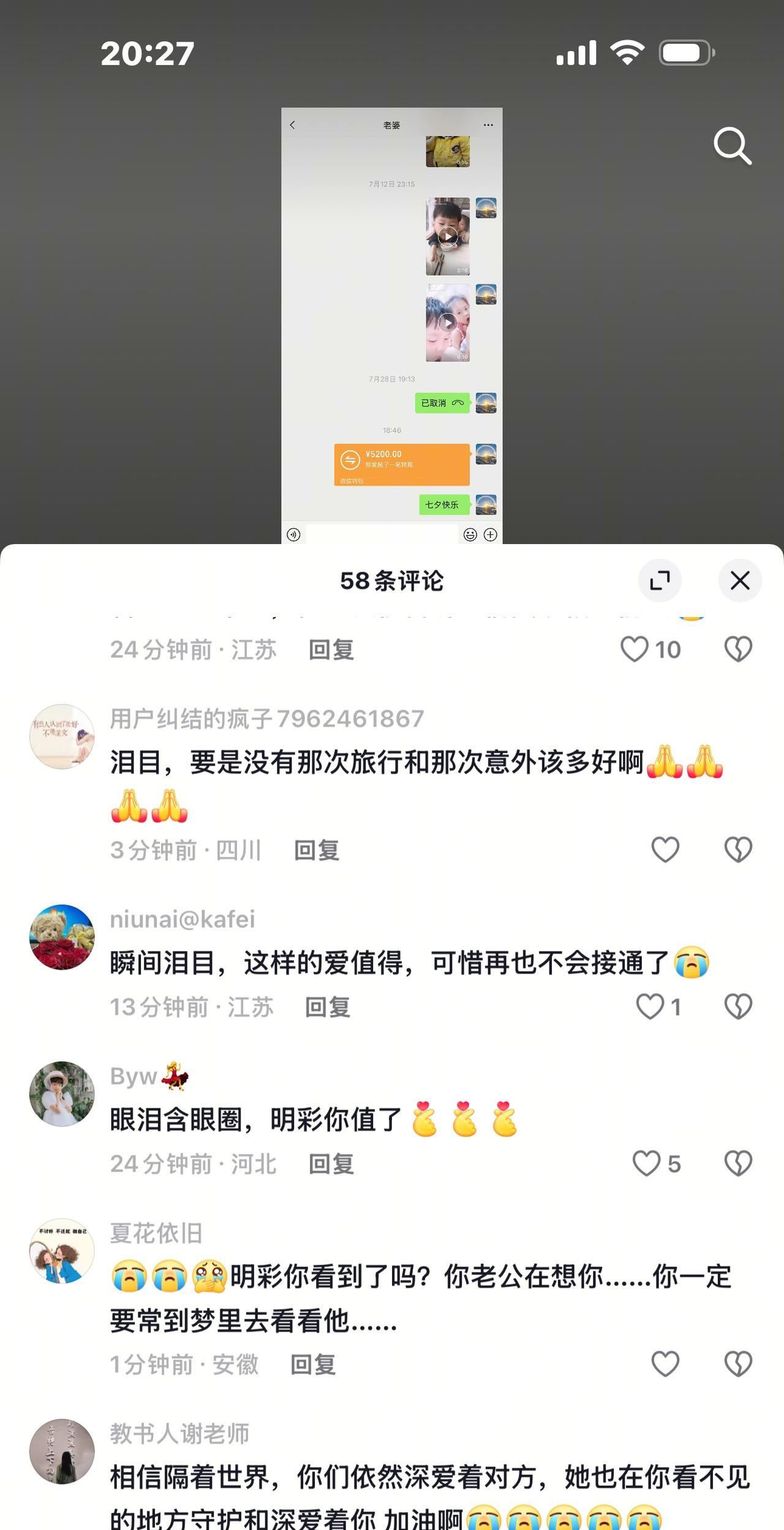 阿坝3对母女坠河事故已近两月。 今天七夕,明彩丈夫仍给亡妻发5200元红包, 却永远没人接收了! 今天七夕节,明彩老公,也就是芯语的爸爸的行为让人泪目。 他还在给明彩打视频电话,发红包给他,想和她讨论孩子们的问题。 想来,去年的七夕,前年的七夕, 以往的七夕也是这么过的,只是今年的七夕,再也没有人回应他了。 仔细看,明彩老公在7月2日妻子和爱女坠河遇难后,7月12日还在给明彩发视频,那是他们共同的爱情结晶,一双可爱儿女一起玩耍的照片,小儿子在摆碗筷,小芯语在后面大笑,还有一个视频,也是一双儿女玩耍的照片。 那时,明彩和女儿的遗体还没有找到,大概明彩老公太想念她们了,希望妻子能托个梦给他,告诉他,她们到底在哪儿吧。或者就是平时和妻子的沟通对话习惯,他们会一起讨论孩子们,现在妻猝然离去,让他难以适从,不相信她已经不在了…… 今天,又是一年一度的七夕节到了。 昨天晚上7点多钟,明彩老公又打视频电话给已逝去多日的妻子,想要跟她说话,沿袭多年来的习惯。 可能他想告诉她,他一如既往爱着她们,他和儿子等着她们回来吧。又或叫她在另一个世界放心,他把小儿子照顾得很好,总之,就是想跟妻子沟通,有那么多倾诉的欲望,像涓涓细流,像滔滔江水…… 当然,视频另外一头永远沉默,不可能再有回应了。 今天,明彩丈夫还不死心,又傻傻地发了一笔转账给早已不在的妻子,数额是5200,谐音“我爱你”,问候天堂里的妻女“七夕快乐!” 太让人泪目了。 以前总觉得明彩丈夫很情绪化,不够理性,妻女坠河后,他常常借酒浇愁,一遍遍循环播放她们生前的视频,不肯走出悲伤,亲友劝说也没用,感觉他有点傻里傻气的,不着调,不像个大男人。 今天却被他深深打动了,特别是看见他昨天发的一则文字,原来他现在还是常常发呆,不能释怀,他说来到30多岁,才体会到生活的无力感,他正面临人生的分岔路口,前路是还没有准备好的柴米油盐,后路是青春岁月,和妻子一路携手走来的甜蜜,却再也回不去了。 这烟火人间,事事值得,也事事遗憾。 这日子不苦,但不开心。 这日子不难,但心很累…… 经过痛失妻女的悲惨事件,明彩丈夫学会了孤独隐忍,不再对外索求,不轻易向人倾诉,慢慢煎熬着自己的疼痛,因为他明白,无法左右的事情太多,无能为力的时候也太多了…… 一位网友深有同感说: “我家仙夫2021年离开时我32,现在我36了,4年了…… 多少个日日夜夜。后面的想法就是只过好今天,不想昨天和明天,发现时间好像走的快了点…… 想太多无法改变发生的事实,说太多无人感同身受,周边这个年纪的朋友都是幸福的家庭,唯有自己独自前行。该怎么释怀呢?如何释怀呢?没有答案,时间越久你会发现,唯有这样过着一天又一天,一年又一年~~~,不知该怎么劝你,因为任何话都显得那么无力。” 是啊,这是一道难以迈过去的坎,不过我们最后还是希望: 一岁有一岁的心境,一站有一站的风景,一直向前走,或许到下下一个路口,你会发现花儿沿途盛开…… [祈祷][祈祷]