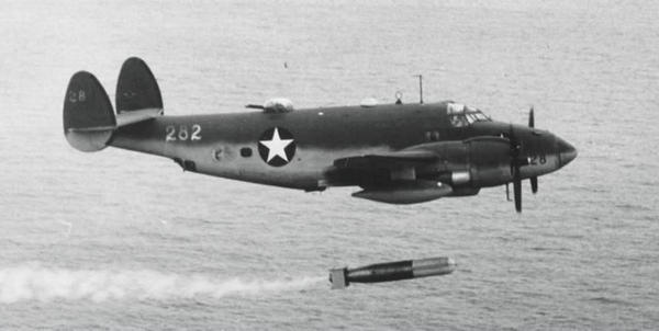 一架美制洛克希德PV-1文图拉轻型轰炸机在华盛顿州萨拉托加海峡试射MK 13航空鱼雷,摄于1943年6月。 早期的MK 13鱼雷性能非常不可靠,1943年中期对105条鱼雷进行的实射测试发现只有31%的鱼雷能正常工作,而很多鱼雷出现了两种以上的故障,美国人因此投入了很大力量进行改进。 照片中这条鱼雷已在尾部安装了木制稳定器,以保证在空中阶段的正确飞行角度,但雷头尚未安装用于减速和吸收入水冲击的木制拖环。鱼雷尾部冒出的浓烟表明其发动机正在全速运转,这也是一个需要解决的问题。因为MK 13的发动机需要海水冷却,此时实际是在干烧,改进后的鱼雷投掷高度增加,干烧时间足以损坏发动机,所以后来设计了一个专门的挡板阀限制鱼雷发动机入水前的转速,也消除了在空中的浓烟现象。
