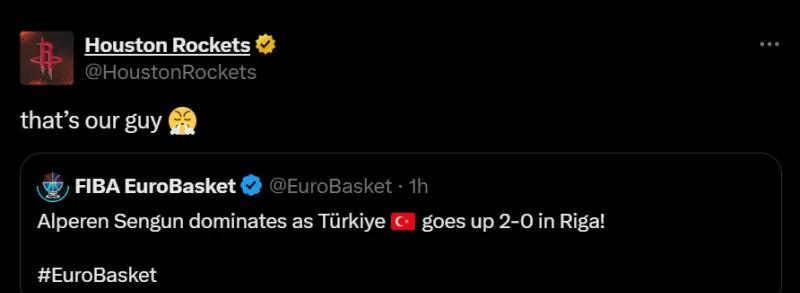 FIBA官方:申京统治了比赛!火箭官方回复:那可是我们的人! 今日欧锦赛小组赛,土耳其以92-78战胜捷克。 此役,土耳其中锋申京表现出色,投篮9中8砍下23分12篮板9助攻。 FIBA官方附文:“阿尔佩伦-申京统治了这场比赛。” 火箭官方回复道:“那可是我们的人。”