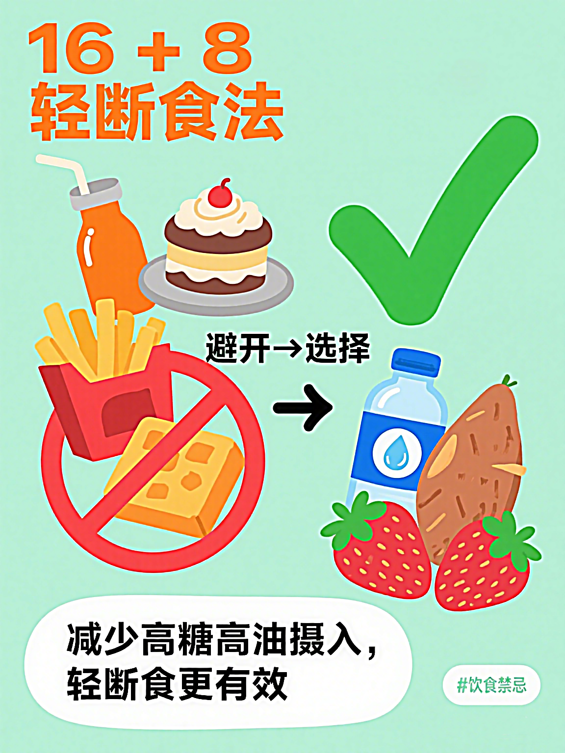 ☑时间窗口:推荐采用9:00-17:00的进食时段。如果16小时空腹太困难,可以从“14+10”(如8:00-18:00进食)开始,逐步过渡适应。