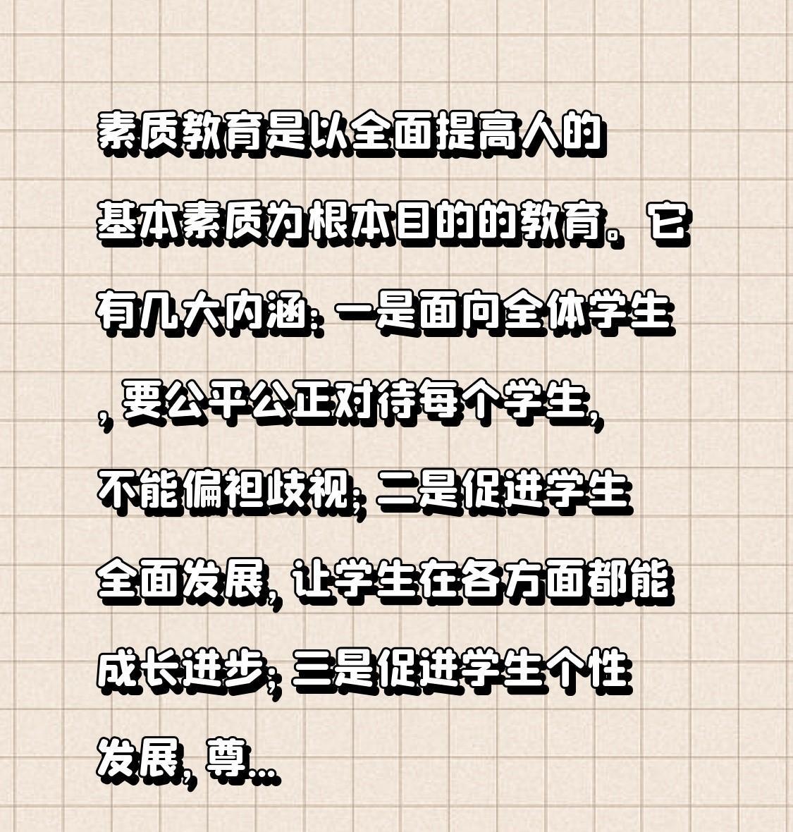 素质教育是以全面提高人的基本素质为根本目的的教育。它有几大内涵:一是面向全体学生,要公平公正对待每个学生,不能偏袒歧视;二是促进学生全面发展,让学生在各方面都能成长进步;三是促进学生个性发展,尊重每个人独特的性格与特点;四是以培养学生创新精神和实践能力为重点,让学生能适应社会发展。在如今竞争激烈的时代,素质教育承担着培养高素质人才的重任。