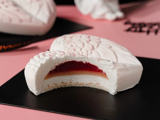 石榴果茸和清水混合加热至40°C,加入提前拌匀的砂糖、菊粉和NH果胶,继续搅拌加热煮至沸腾离火,装入放好保鲜膜的水滴模具(长9cm宽5cm)内冷冻冻硬。