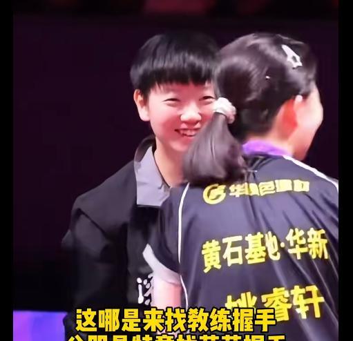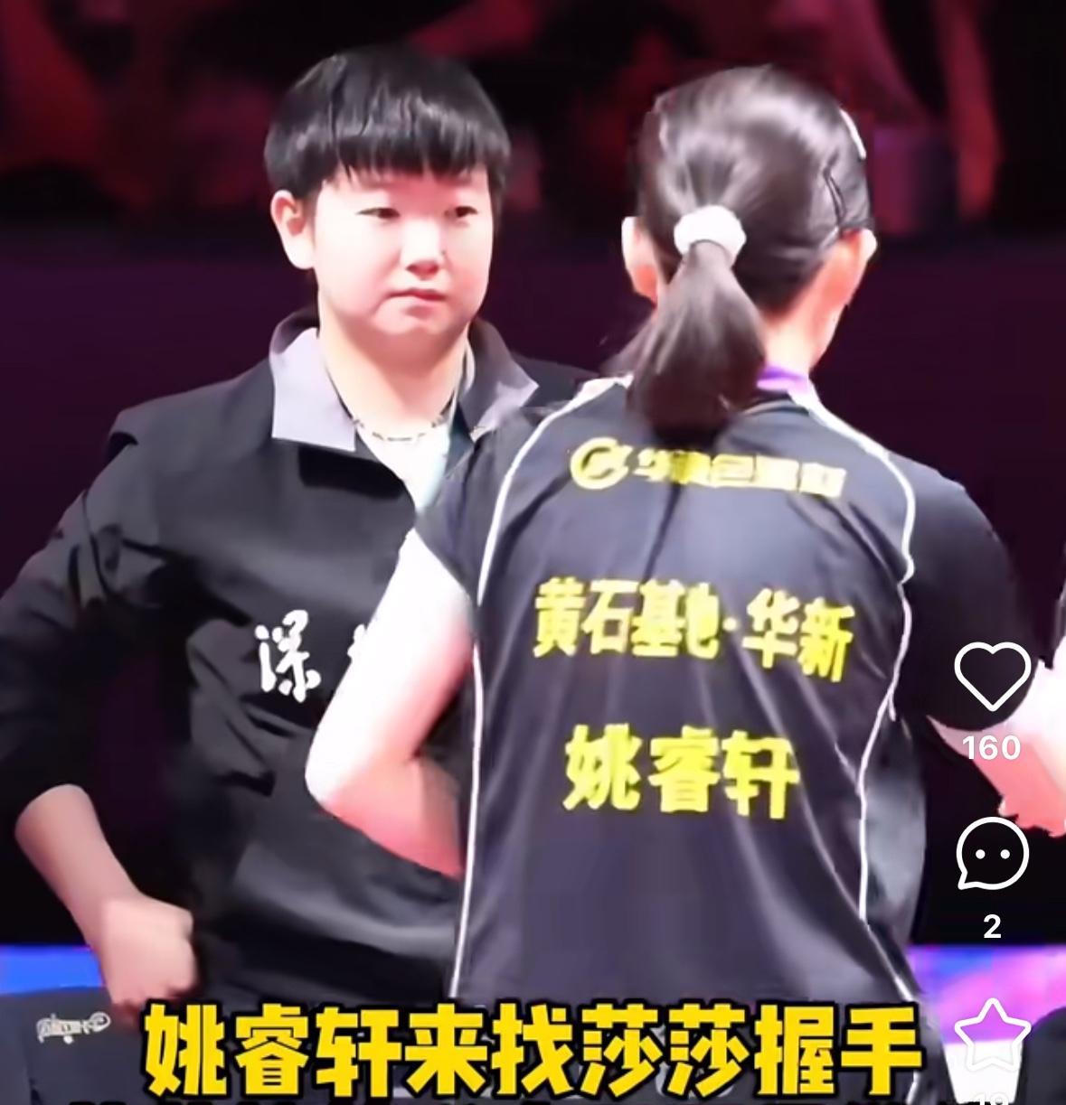师妹姚睿轩找莎莎握手 孙颖莎笑着说“我不是教练!” 8月30日, 乒超联赛第三阶段新疆站, 姚睿轩3:0覃予宣 莎莎笑容明媚“我不是教练” 又是快乐乒超的一天! 不过今天深圳大学3:2黄石华新 孙颖莎第五盘力挽狂澜, 11:3,11:4,11:8 拿下姚睿轩,为深圳大学贡献二分! 姚睿轩可是莎莎的小师妹, 也是河北队的, 09年出生,16岁, 又是一个小莎莎……