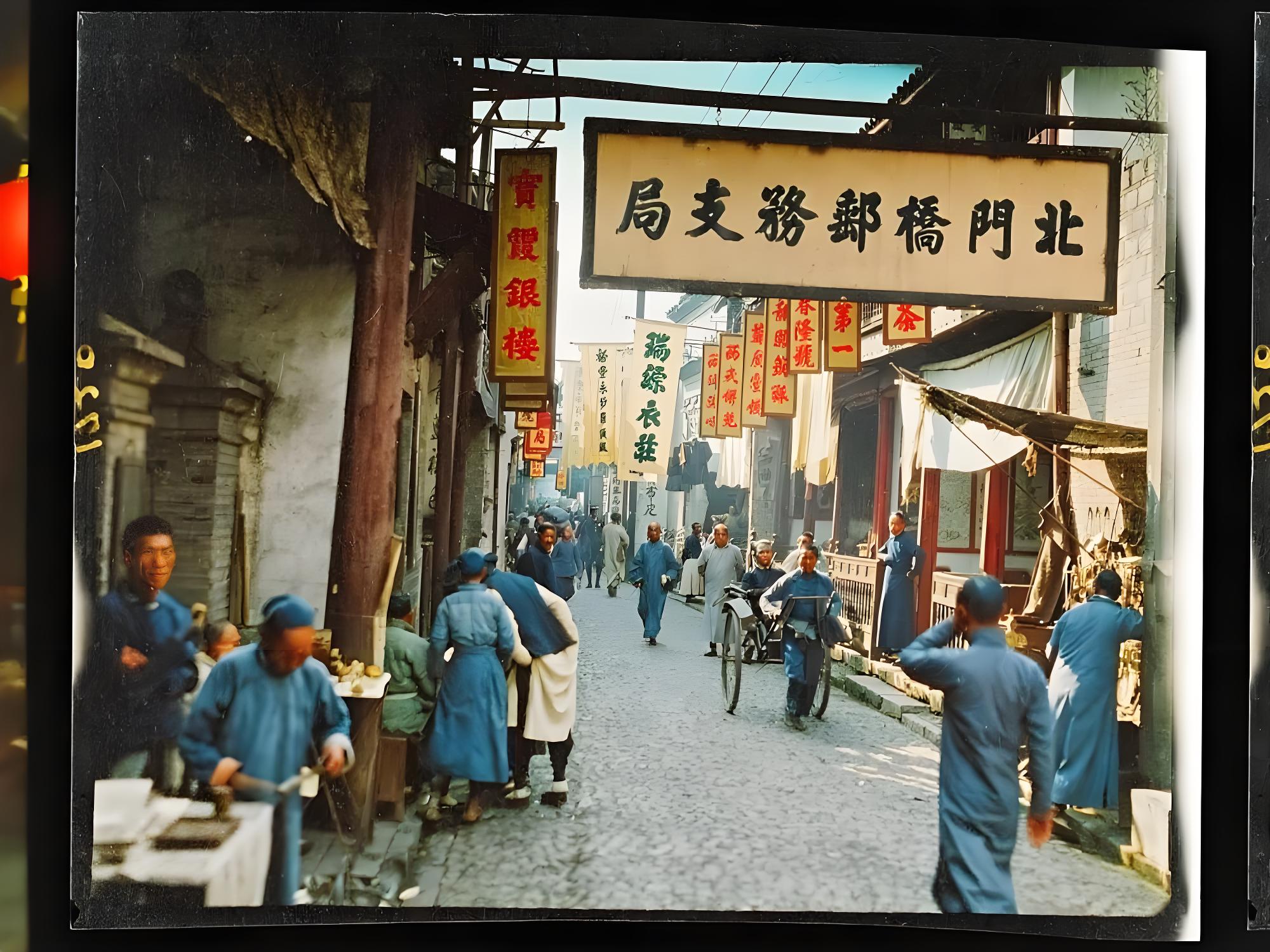 北门桥街道,位于江苏南京(1917-1919年),一派古韵盎然的市井风情。青石板路蜿蜒伸展,街巷间商贩的吆喝声与行人的脚步交织,勾勒出民国初年南京的生动剪影,承载着那段时光的烟火气息与历史况味。