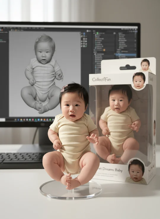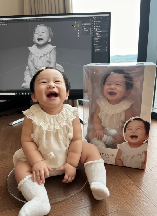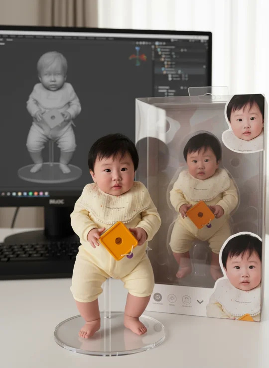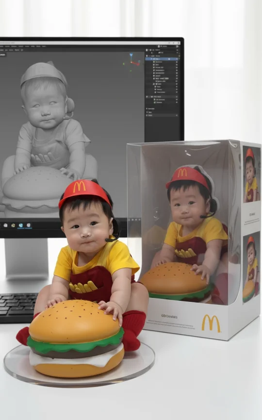 Use the nano-banana model to create a 1/7 scale commercialized figure of thecharacter in the illustration, in a realistic styie and environment. Place the figure on a computer desk, using a circular transparent acrylic base without any text.On the computer screen, display the ZBrush modeling process of the figure.Next to the computer screen, place a BANDAl-style toy packaging box printed with the original artwork.