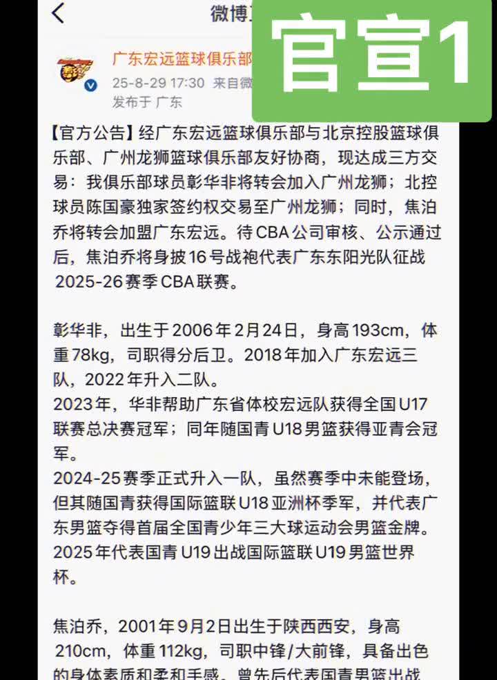 官方公告:经广东宏远篮球俱乐部与北京控股篮球俱乐部、广州龙狮篮球俱乐部友好协商,现达成三方交易:我俱乐部球员彰华非将转会加入广州龙狮;北控球员陈国豪独家签约权交易至广州龙狮;同时,焦泊乔将转会加盟广东宏远。待CBA公司审核、公示通过后,焦泊乔将身披16号战袍代表广东东阳光队征战2025-26赛季CBA联赛。 彰华非,出生于2006年2月24日,身高193cm,体重78kg,司职得分后卫。2018年加入广东宏远三年,2022年升入二队。2023年,华非帮助广东省体校宏远队获得全国U17联赛总决赛冠军;同年随国青U18男篮获得亚青会冠军,2024-25赛季正式升入一队。虽然赛季中未能登场,但其随国青获得国际篮联U18亚洲杯季军,并代表广东男篮夺得首届全国青少年三大球运动会男篮金牌。 2025年代表国青U19出战国际篮联U19男篮世界杯。 焦泊乔,2001年9月2日出生于陕西西安,身高210cm,体重112kg,司职中锋/大前锋,具备出色的身体素质和柔和手感。曾先后代表国青男篮出战U16亚青赛、U17世青赛、U19世界杯。从美国圣帕特里克高中毕业后,2022-23赛季起代表广州龙狮征战CBA联赛,并在2023、2024年度连续......