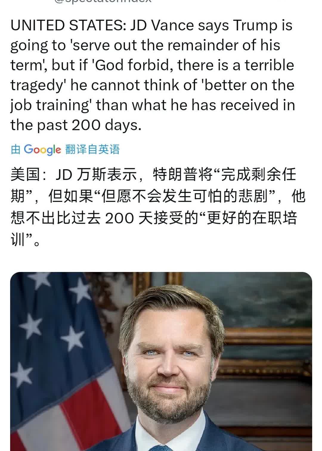 美国副总统万斯今天(8月29日)接受《今日美国》专访时表示,如果发生“可怕的悲剧”或特朗普健康问题,他已接受200天的在职培训并准备好接任美国总统。但是万斯强调特朗普的健康状况极好,精力惊人。 美国副总统本就是总统的“备胎”,从贫民窟里走出来的“乡巴佬”也有想当总统的欲望,而且已经做好接任总统的准备,只可惜特朗普的身体还算健康。万斯的言论更多的是向共和党人宣示,他要参选美国下届总统。