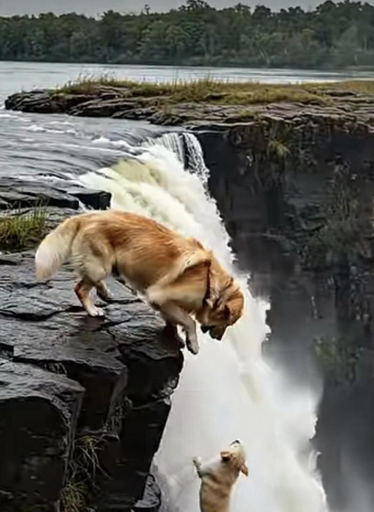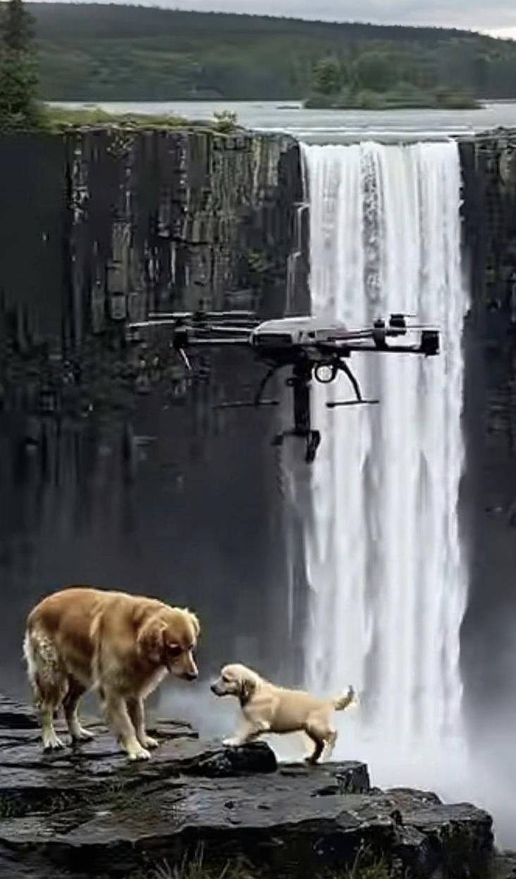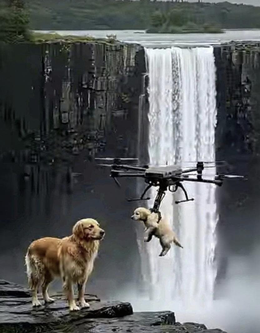 当无人机化身“空中救援侠”,在瀑布激流间精准救下遇险的小狗,一旁的金毛满眼担忧后
