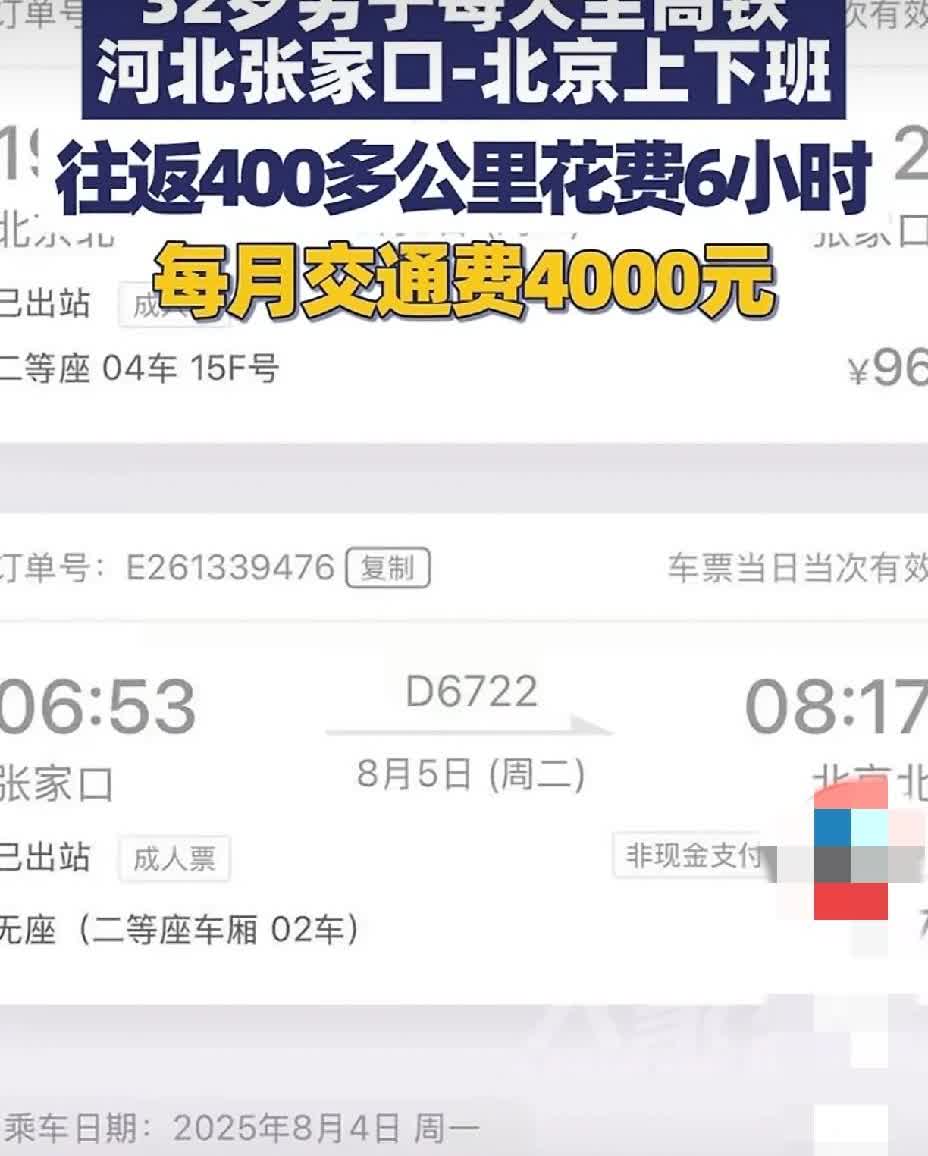 天天坐高铁上班第一人出来的,每天往返400多公里,从张家口到北京,每月花费高铁票4000多元。 这种情况在全国还能不能找到第二个?张家口32岁男子,早上从张家口坐高铁到北京南,晚上又从北京南返回张家口,单次花费96元,一天的高铁票就是192元,除了周末双休,月花销也得4000多元。 好在这名男子,住的地方离张家口高铁站不远,工作的地方离北京南也不远,所以每天花费的时间并不多,往返也就4小时不到。 这个感觉还不错,就是太费时间太费钱了,难道就不累吗?
