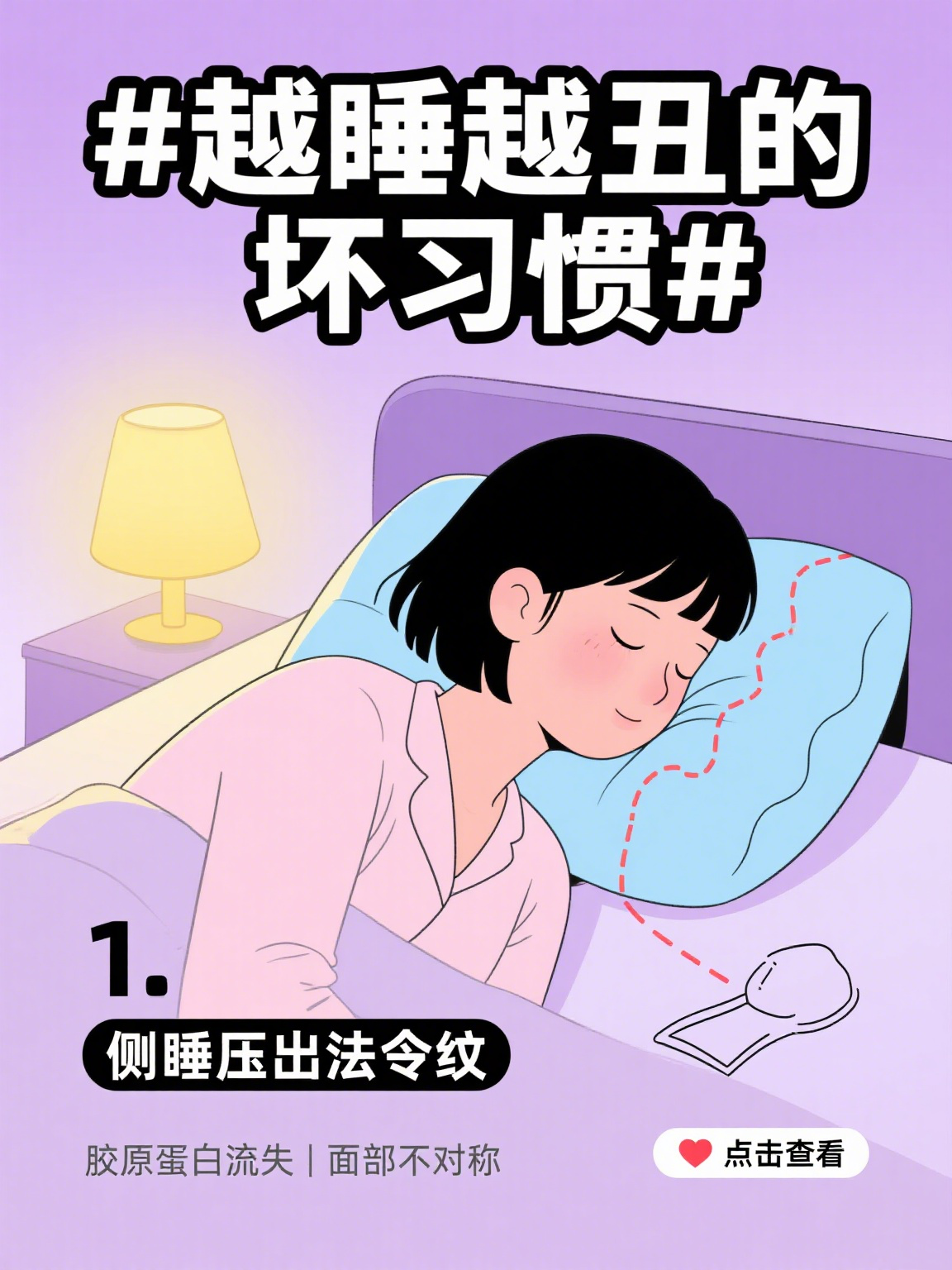 调整为仰卧或半侧卧(30-40度角),减少面部挤压。 选择丝绸枕套,减少摩擦。 睡前涂抹含胜肽的晚霜,增强皮肤弹性。