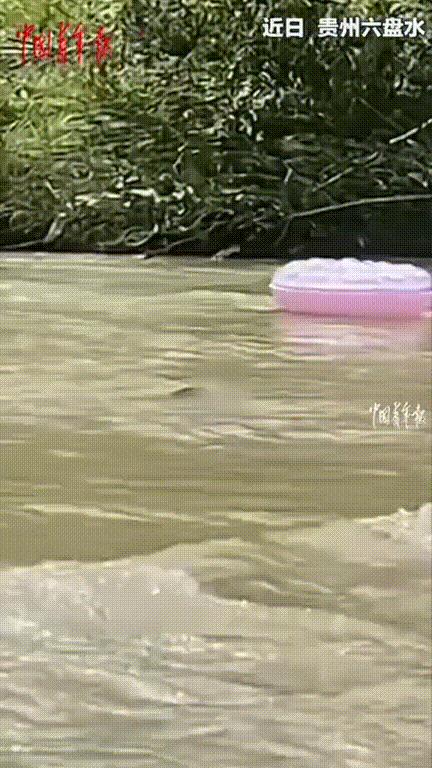 太幸运了!贵州六盘水,一小孩带着泳泳圈在河边玩,稍不留神就被水流冲走了,身体从泳