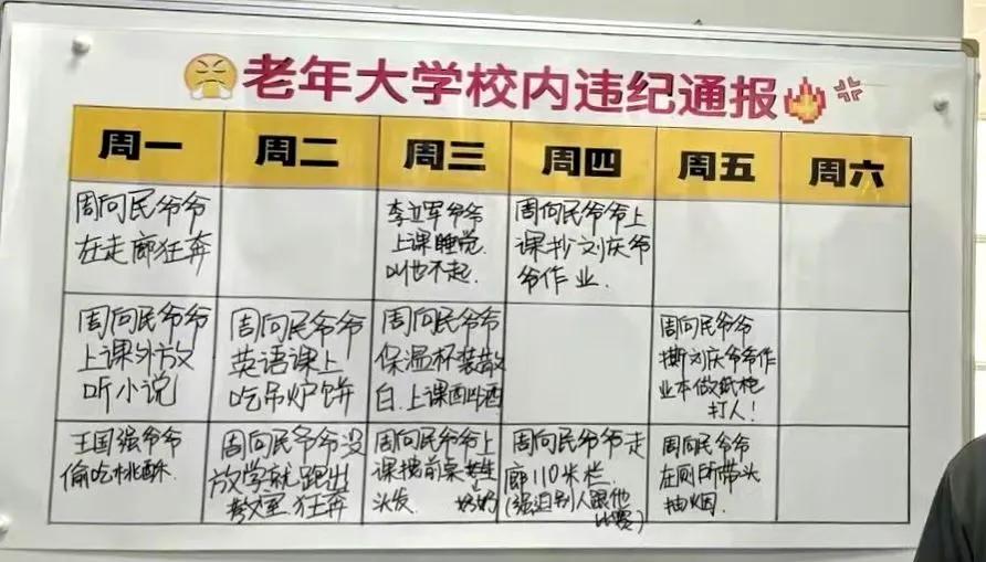 这才是真正的学生都是“祖宗”,老师都是“孙子”的真实写照!这样的学校叫——老年大学! 大家看看,这个名叫“周向民”的“爷爷级学生”,在学校里是如何调皮捣蛋的。 从周一到周五,没有一天周向民爷爷不违犯校规——上课时手机外放、吃东西、在走廊狂奔、喝酒、扯前排奶奶的头发、抄作业 、撕作业本做纸枪、厕所抽烟等等。 这完全就是一个不遵守校纪校规的坏学生啊。这要是放在其他学校,周向民早就被请家长不知道多少回了,甚至都已经被开除了。 但是在这个学校,上面这些处罚手段都是不存在的。不仅不能处罚,在将周向民同学的这些违规行为进行公示的时候,还得老老实实在他名字后面加上“爷爷”二字 ,以示对他的尊重!如果不这样做,周向民一不高兴,轻则退学不来了,重则说不定会断了这个学校的经费! 大家有什么招,能帮助老年大学教训教训一下这个周向明爷爷同学?