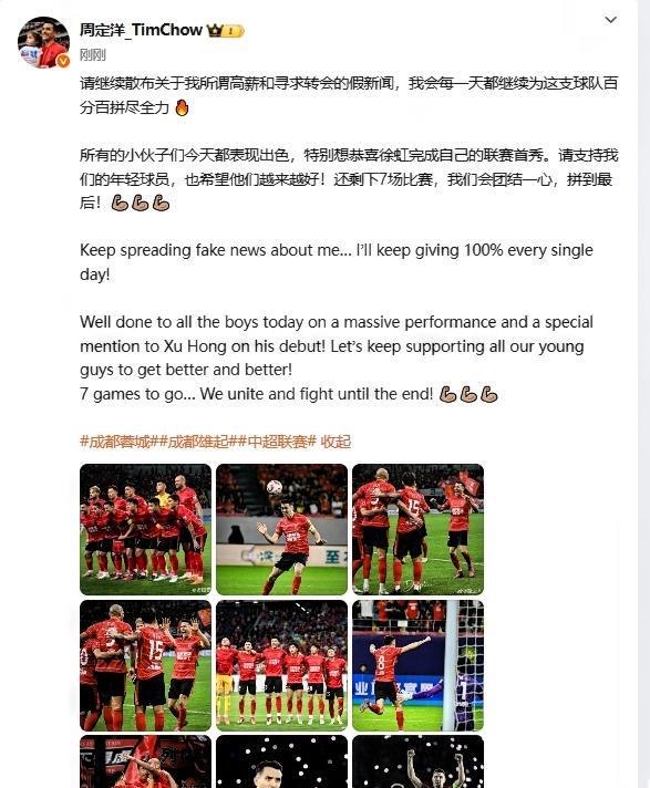 周定洋直接硬刚李平康!无良媒体人阴谋落空!周定洋喊话请继续散布我所谓寻求高薪的假新闻,我会每一天都为球队拼尽全力! 近期,媒体人李平康一直在散布成都蓉城的负面新闻,比如蓉城换帅提上日程,比如费利佩、罗慕洛续约不顺利,还有就是周定洋索要高薪,等一系列虚假新闻! 作为一个媒体人,你是何种心理散布这些虚假信息?有什么目的?想扰乱蓉城军心?一个好的球队没那么容易被你扰乱!昨天的4-1就是要狠狠打你的脸!好自为之!