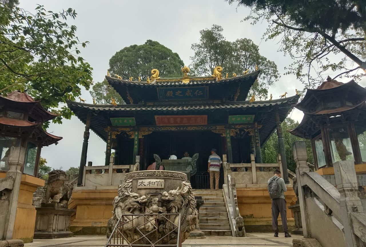来到昆明金殿景区。传说金殿是吴三桂府邸,1671 年,吴三桂在明代铜殿的二层基座上重建了真武铜殿,用铜总量达 250 吨,是当时国内最大最重的铜殿建筑。又传说金殿是吴三桂为陈圆圆所建。据说真武大帝依据吴三桂形象塑造。