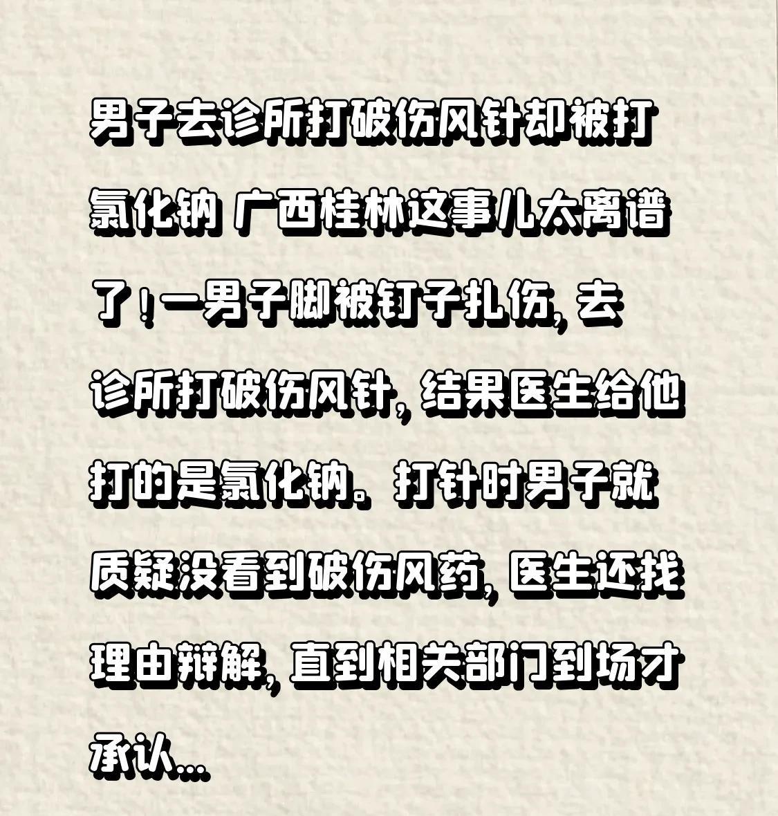 男子去诊所打破伤风针却被打氯化钠广西桂林这事儿太离谱了!一男子脚被钉子扎伤,去