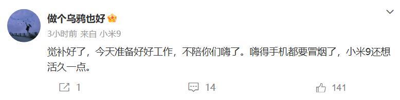 哪个大佬给木子美赞助个手机啊,小编还想吃瓜[捂脸] 前几天,木子美在社交平台爆的瓜,想必大家吃的都意犹未尽。 今天,木子美发文:“今天准备好好工作,不陪你们嗨了。嗨得手机都要冒烟了,小米9还想活久一点。” 据了解,2019年,小米9发布。起售价2,699元人民币。用了6年,质量杠杠滴,就是处理不了海量的网友留言了。[偷笑]