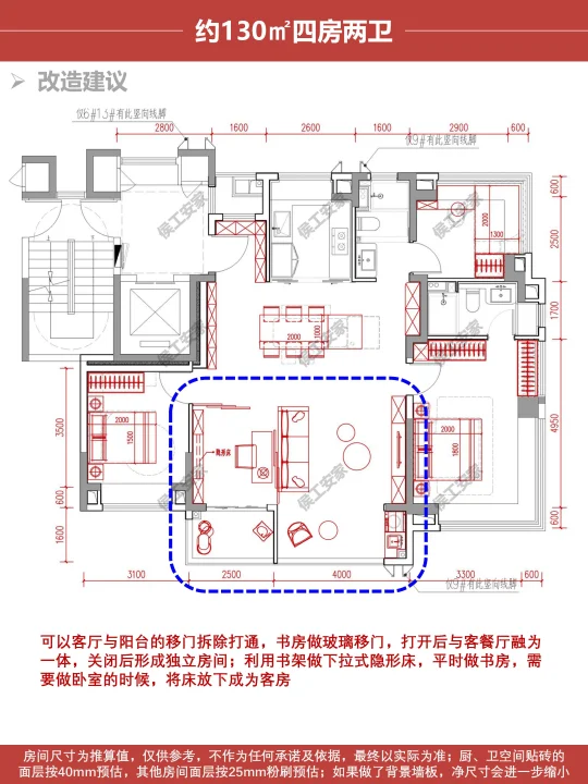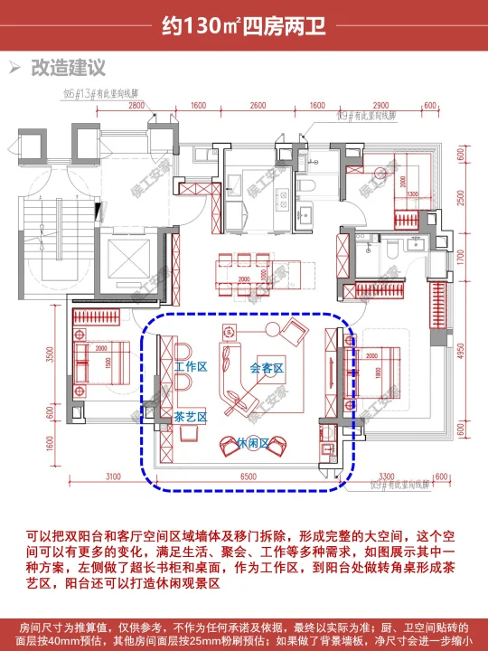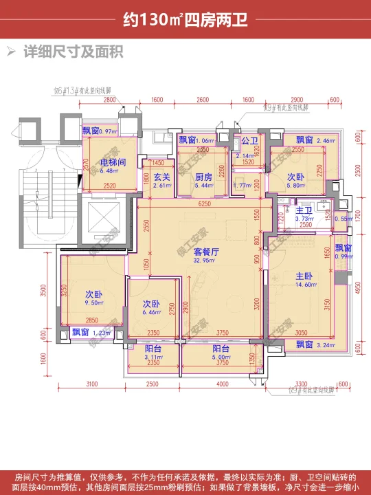 户型尺寸为推算值,仅供参考! 约130㎡做到了四房两卫、双阳台,其中包含一个功能可变的X空间,配置上很无敌; 类一梯一户、全明电梯厅、内外双玄关,归家尊贵感和仪式感拉满; 南向房间和客餐厅、阳台打通一体化设计后,整体形成了使用面积约50㎡的超大方厅,打造豪宅般的居住体验; 南北两个房间都做了270度转角飘窗,视野通透性和采光都非常好,厨房也有飘窗赠送,整体来说产品力非常无敌; 保利虹桥和颂 保利虹桥和颂户型 户型 户型设计 户型改造 上海新房 上海买房 侯工安家 如未说明,涉及面积指建筑面积