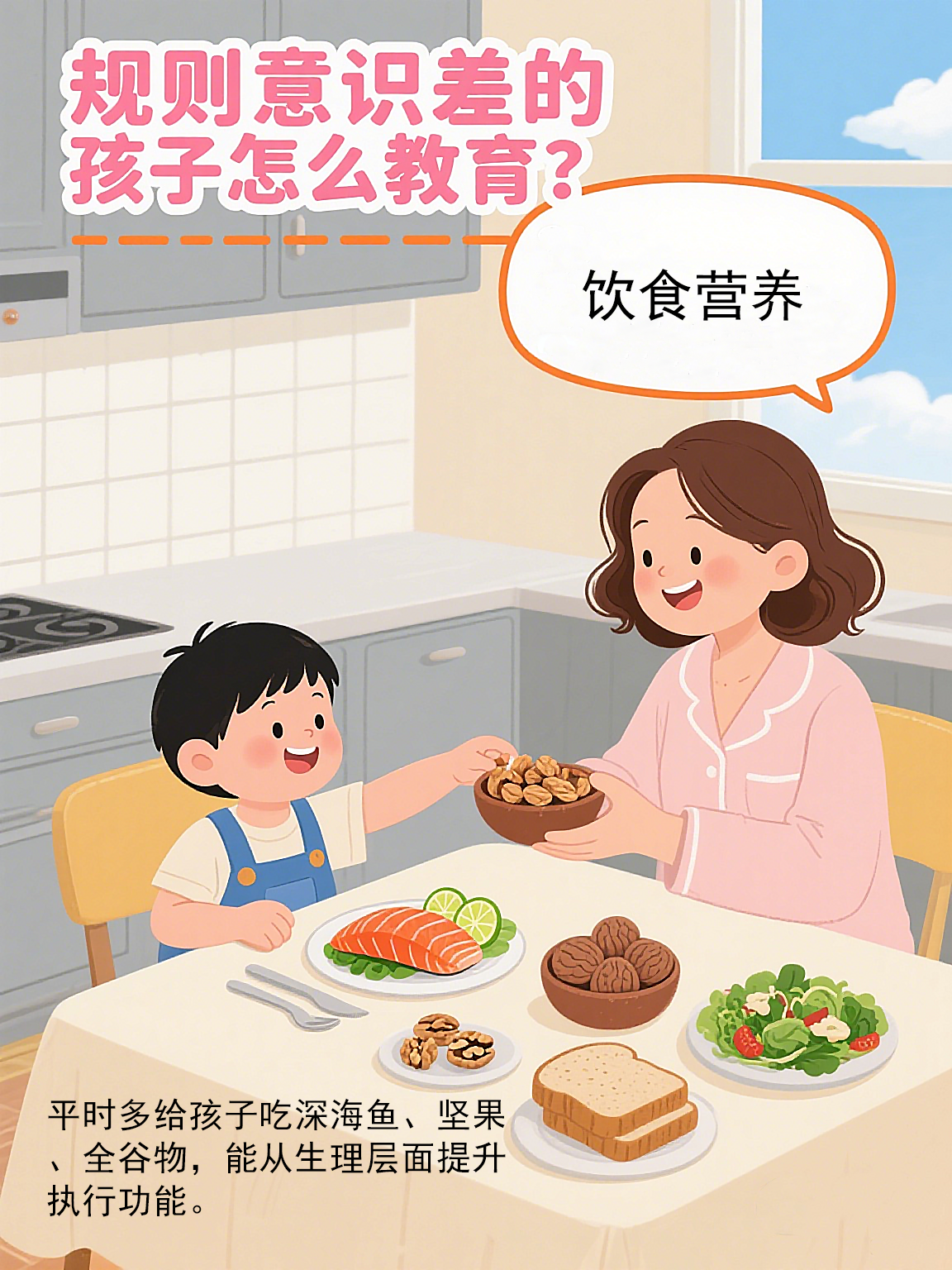 2️⃣ 饮食营养是规则意识的“燃料” 研究表明,缺乏Omega-3脂肪酸、维生素B族的儿童,大脑前额叶发育较慢(这是负责自控力的脑区!)。平时多给孩子吃深海鱼、坚果、全谷物,能从生理层面提升执行功能。