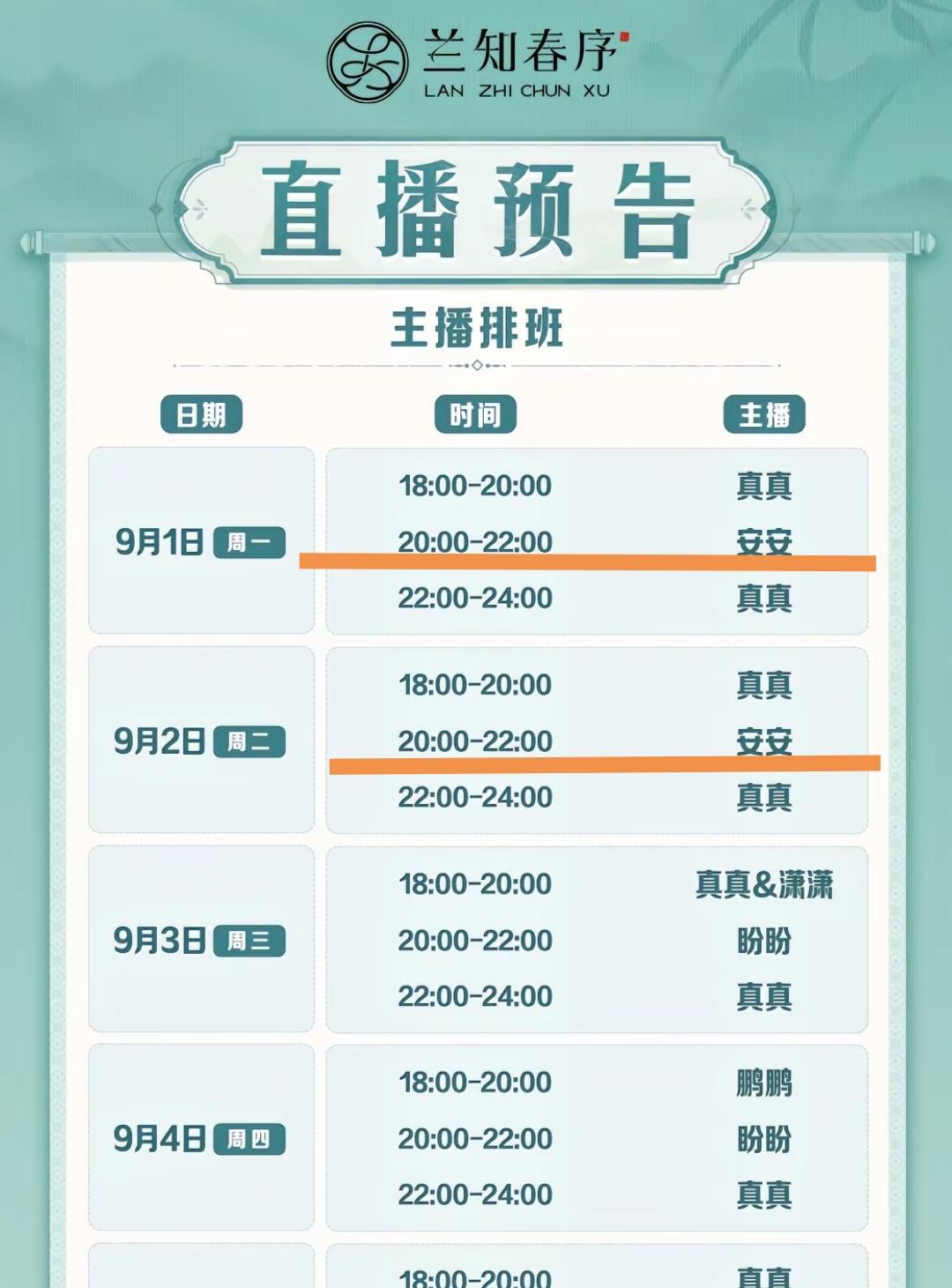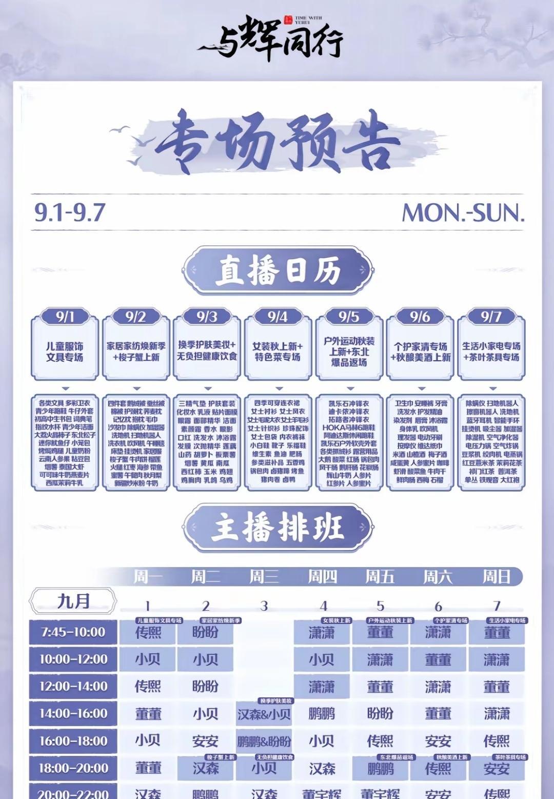 与辉同行和兰知春序下周的排班表更新,下周三个新安排。 1,董宇辉4号回归,连播两天,5号有东北爆品返场。 有网友说,终于要回来了,又有十多天没见了,这几天在评论区偶尔还能碰到他,全是他的杀马特表情包。 2,3号阅兵,与辉同行上午休息停播,公司可能组织大家看阅兵,这是举国同庆的大事,一定不容错过。 3,小兰的排班,安安派过来了,和真真配合播两天。 真真现在越来越稳了,排班的时间也开始变多。 马上要开学了,下周小兰暑期节目暂时告一段落,以前的“好读书”栏目继续。 有朋友说,这次安安开始在小兰上班,如果这样,那以后两个号就慢慢互通了,两边都互相安排。 只是小兰的主播还远远不够,期待更多有才华的新主播快点通过考核培训,争取早日上镜。