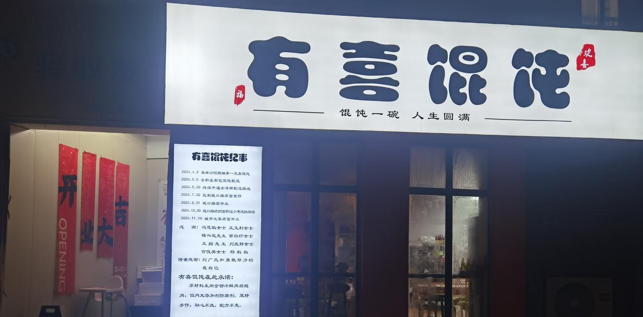 今天遇到四个很有趣的顾客,四个二十啷当岁的小帅哥,来店里是因为其中一个小帅哥跟前女友分手的时候在我店里吃的,他说具体当时说了什么忘记了,只记得馄饨好吃了。 正好他们四个不知道晚饭吃什么,他说有家馄饨店挺好吃的,就来了。 他们四个来了之后对我门口的有喜馄饨纪事很感兴趣,一顿拍照,进来店里就跟熟客一样,跟我打招呼,点餐,一点陌生感都没有。 然后他们就自然的聊起来小帅哥的前女友,我一边煮馄饨一边笑说,旧的不去,新的不来。 他们几个开始起哄,唉,对对对。 这不是你分手归分手,带我们来到这家馄饨店么。 馄饨煮好后他们四个轮流都尝了,各个举起大拇指,都说这里太偏僻了,他们家住龙湖天街那边,希望我去那边开店。 哦,龙湖天街啊,我第一时间就想到了我经常去金牛区的龙湖天街玩,又想到了非天夜翔的《龙湖天街爱情故事》那本书。 好吧,思绪扯远了,我说没有钱开分店。 小帅哥说他有钱,他投资我,当股东,觉得我馄饨好吃,投我是稳赚不赔的。 我只捂嘴笑,轻松拒绝,我说你已经是不知道多少个说给我投资的了,我拒绝合伙。 不是不相信人,是我真不会算账。这件事就一笑而过,一顿饭聊的很愉快,最后结账75,小帅哥说打个折,八十吧,我义正言辞的拒绝,我们从来不拿顾客一针一线,不占顾客一分钱的便宜。 好吧,收款75。 四个帅哥说下次来,我说好吧,下次勉为其难请你们喝饮料吧。 他们还说要带很多人来,好吧,要请很多饮料了[捂脸] 好可惜啊,长的挺帅的都,就是年龄太小了,大点就好了[呲牙][呲牙]