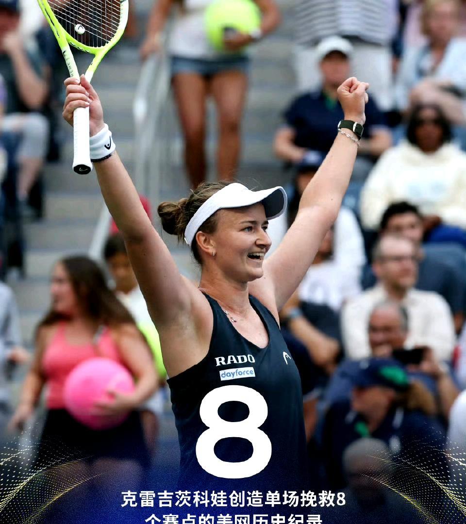 创造单场挽救赛点历史!克雷吉茨科娃挽救8个赛点实现逆转。 美网2025女单第四轮