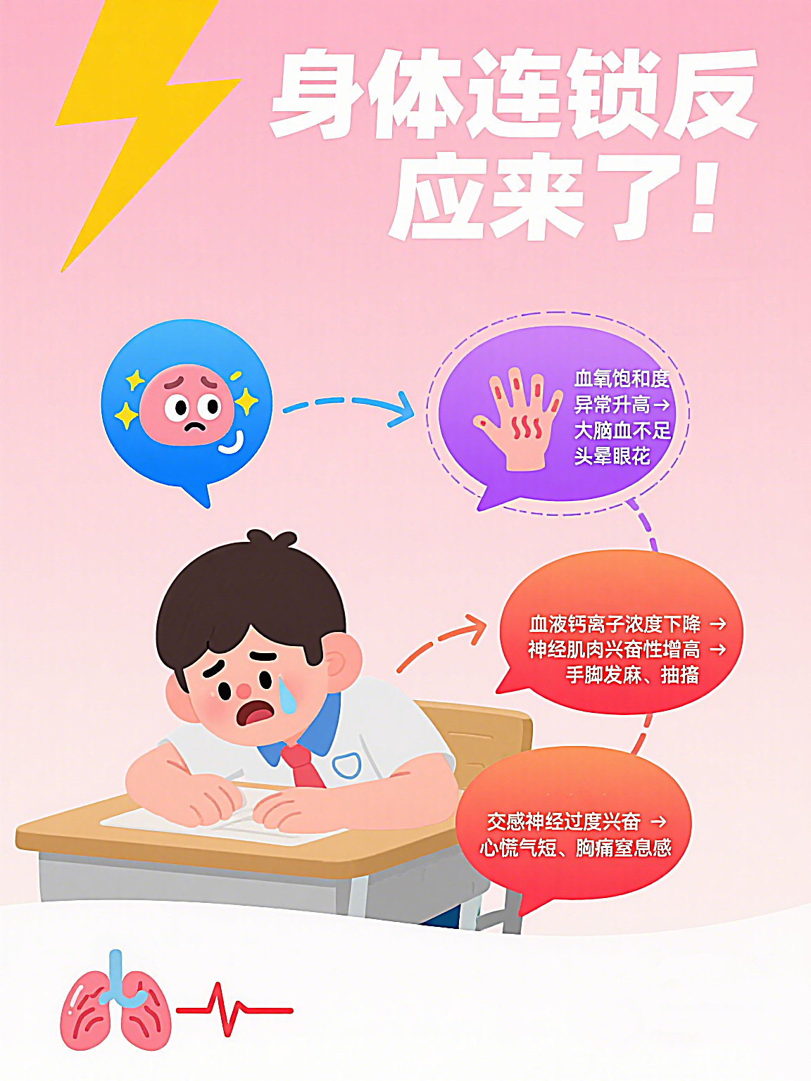 2️⃣ 身体连锁反应 ▶️ 血氧饱和度异常升高 → 血管收缩 → 大脑供血不足 → 头晕眼花 ▶️ 血液钙离子浓度下降 → 神经肌肉兴奋性增高 → 手脚发麻、抽搐 ▶️ 交感神经过度兴奋 → 心慌气短、胸痛窒息感