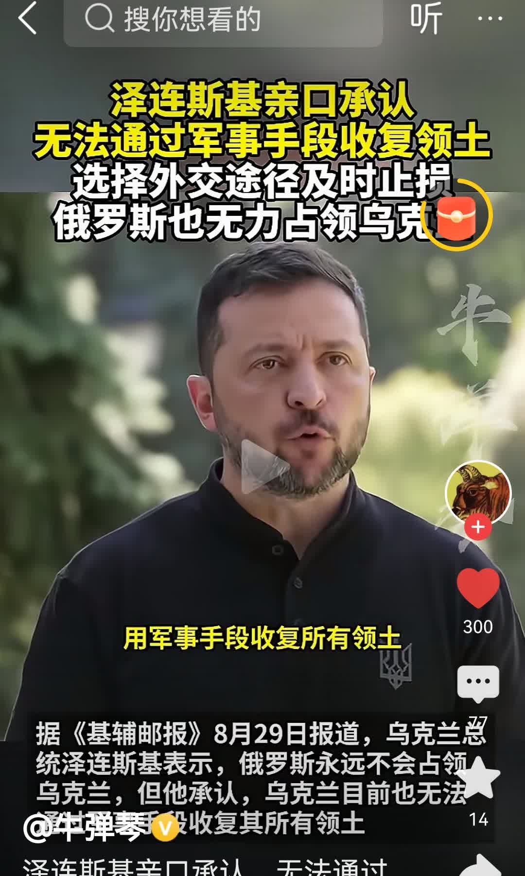 2025年8月31日,乌克兰总统泽连斯基承认:乌克兰想通过武力来夺回被俄罗斯占领的领土,已不可能。 通过外交途径解决问题的方法,比打仗好!但,战场上得不到的东西,谈判桌上是别想得到。 打和谈比较起来,打应该比谈和好。——不要轻易言放弃。我们的抗日战争也不是整整打了八年呐。要坚信“星星之火,可以燎原。”宜努力、宜强强!