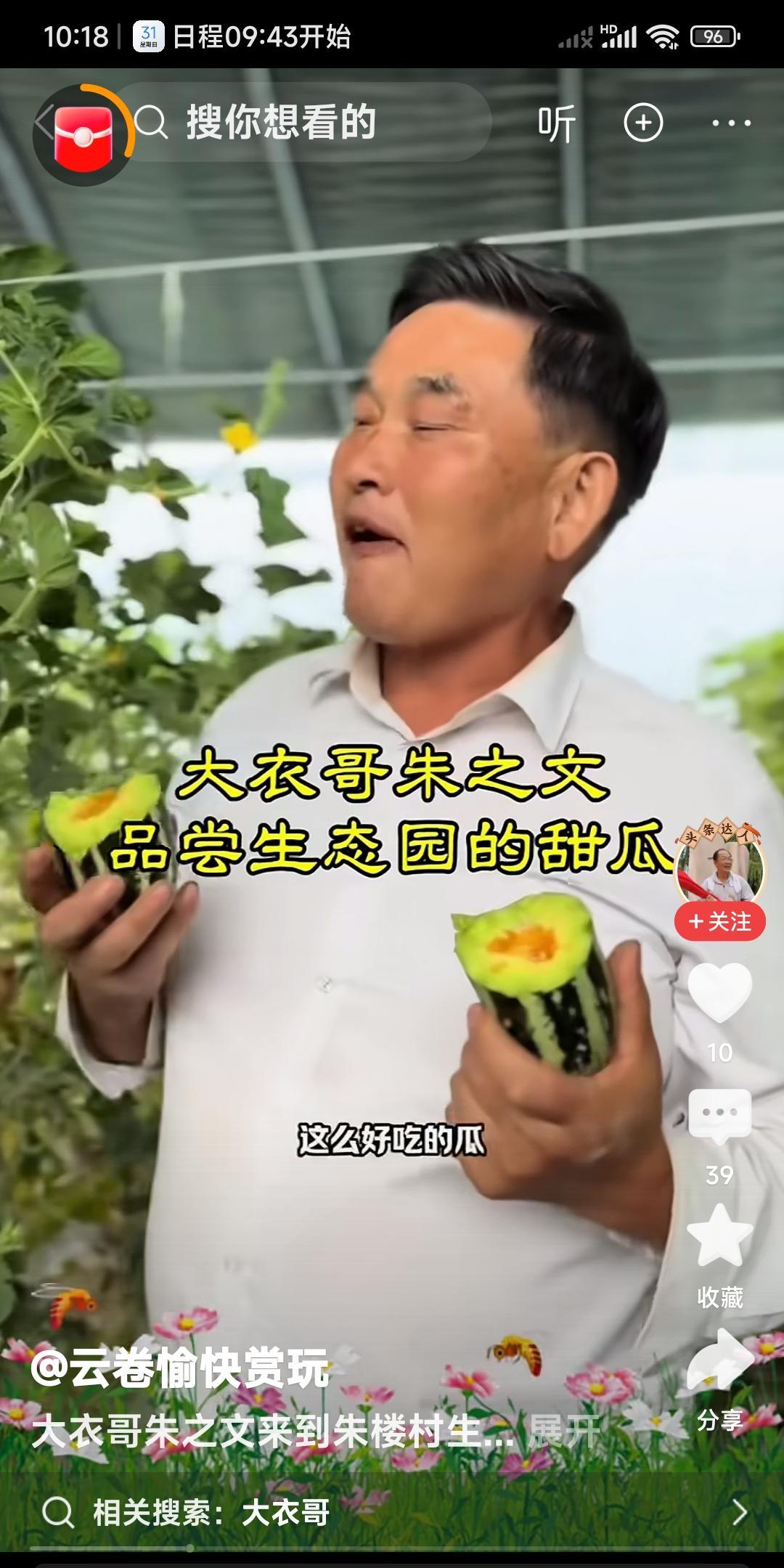 能吃是大衣哥的标志。 不仅鸡鸭鱼肉大虾能吃。 看看到了水果园,一手拿一个甜瓜在那