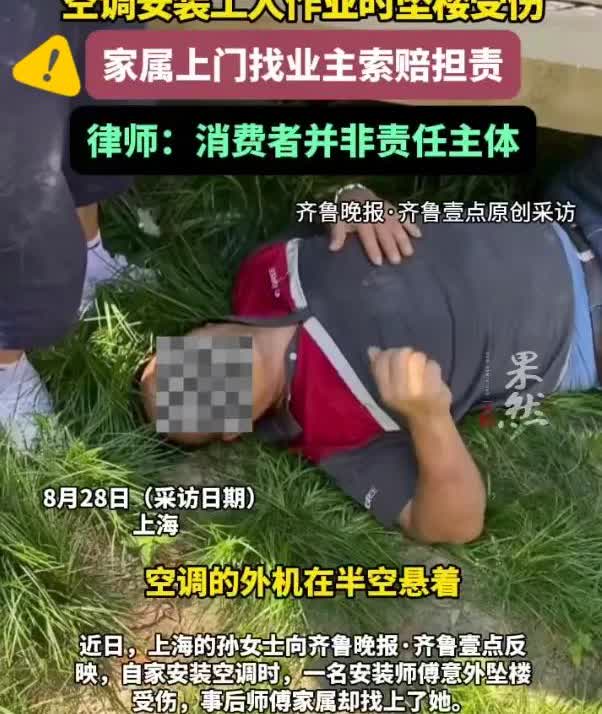“这跟我有什么关系?”上海,女子在商场买了两台空调,满心期待等着安装,结果“砰”一声巨响直接吓懵——安装师傅居然从3楼掉下去了!她第一时间叫120、报110,忙前忙后帮着救急,以为自己尽到了业主的本分,可接下来的事让她彻底崩溃。 五天后,伤者家属带着六个人找上门讨说法,理由是“找不到负责的单位,只能找事发地业主”,之后更是天天来闹,把孙女士的生活搅得鸡犬不宁。其实孙女士比谁都委屈,她在正规商场买的空调,品牌说包安装,订单却写着商场负责,现在两边都装聋作哑,把锅甩给了她这个无辜的买家。 我真觉得这事儿太离谱了!买空调送安装,本质是商家提供的服务,工人是商家派来的,又不是业主自己雇的,凭啥出了事要业主担责?从法律上讲,只要业主没瞎指挥、家里环境也没安全隐患,责任就该归雇工人的单位。 这事儿也给所有人提了个醒:以后不管买家电还是找装修,一定要在订单或聊天记录里写清楚“安装出问题由商家负责”,别嫌麻烦,截图存好,不然真遇到孙女士这种事,哭都没地方说。 大家觉得这事儿女子该担责吗?要是你遇到这种情况,会怎么处理呢?