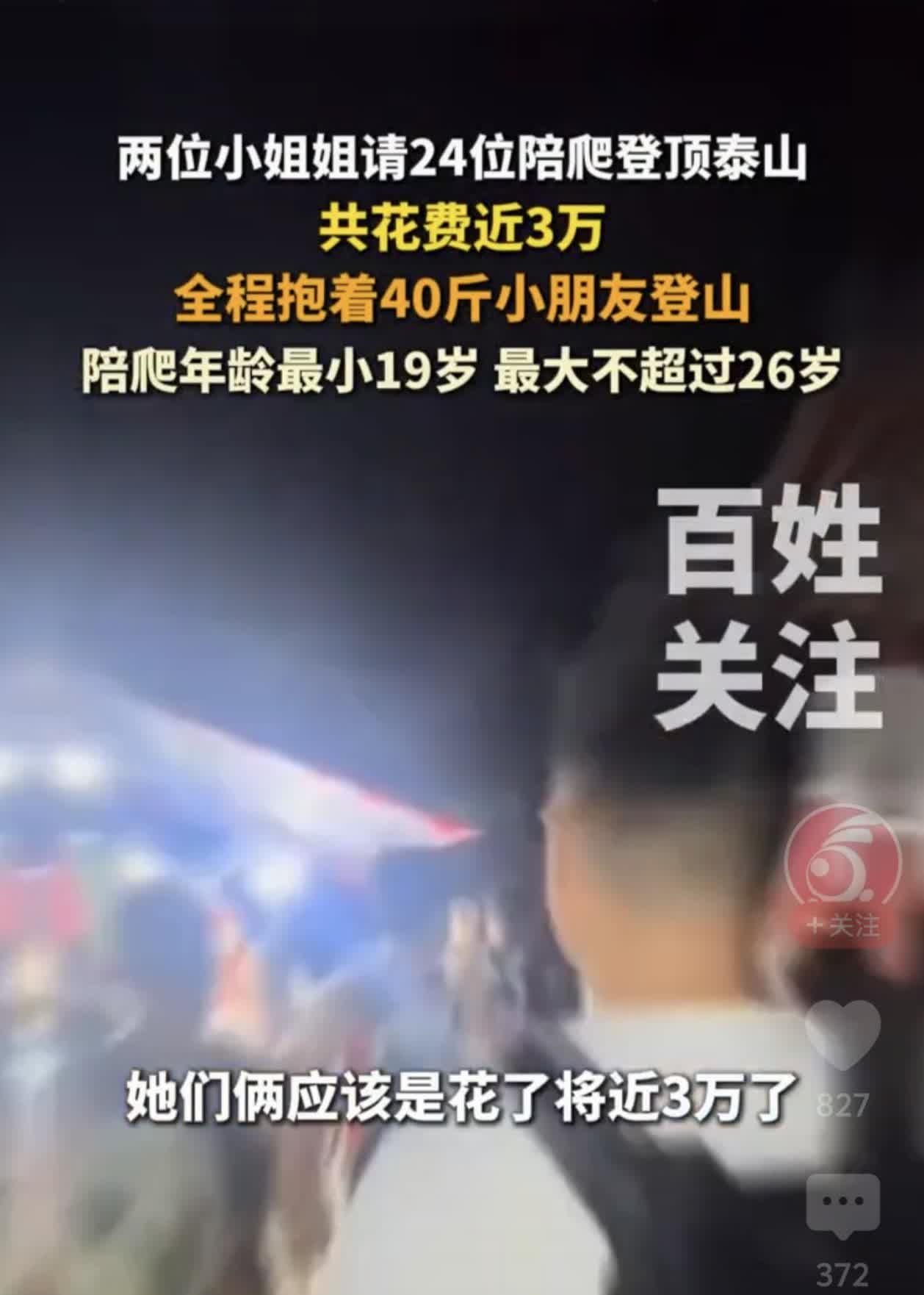 天价陪爬泰山!两女子花3万请24人服务登顶 近日,一则“两女子花3万元请2