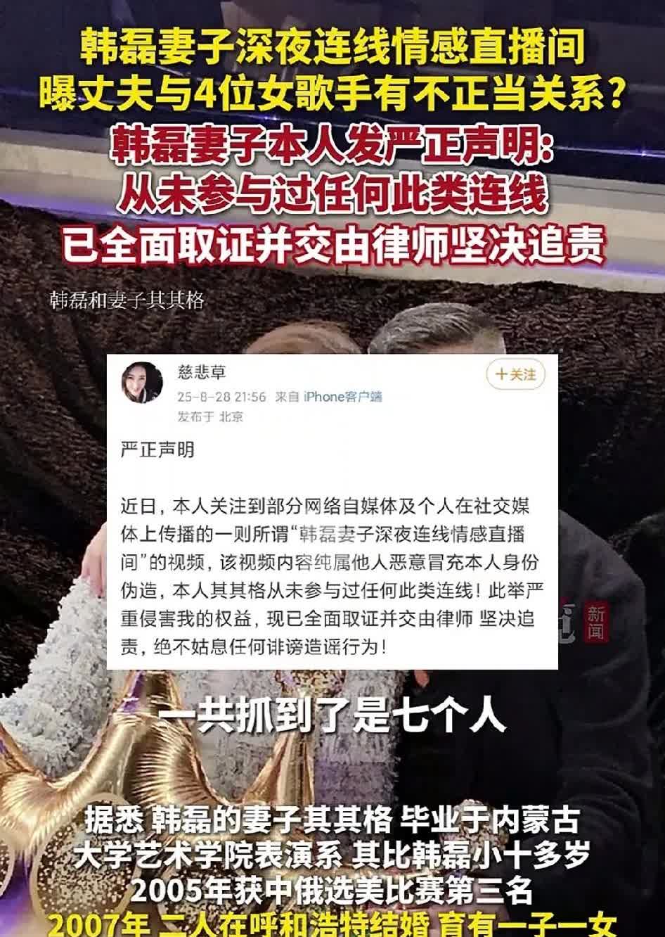 胆子也太大了吧!在一直播间中,一女子和主持人连线,自称是著名歌手的老婆,说此歌手演唱过很多电视剧主题曲,爆料此歌手出轨等问题,经过主持人和连线人对话,直播间里炸裂了,纷纷猜到此歌手是韩磊! 此事闹得满网都是,韩磊老婆出面澄清,电话根本就不是她打的,此事就是造谣,会追求其责任。造谣者也发表声明澄清了! 这些人是没事闲的吗,冒充人家老婆造谣,花费那些时间,来编造这些谎言,有意思吗! 造谣真是随口就来,胆子可真是太大了!她不害怕承担相应的法律责任吗?