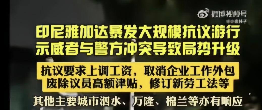 印尼总统向示威者“投降”?接受示威者诉求,对议员采取果断措施:取消发布虚假陈述议员的津贴。同时暂停所有议员的出国出差津贴补助! 最新报道称:印尼这次示威游行,是由工党与工会联合发起,要求上调工人工资,取消企业业务外包,废除议员高额津贴,修订“新劳工法”等。 如此看来,这次大规模示威游行,有一定“反腐败”与“争取工人合法权益”等积极意义。但要全面落实,实现示威者愿望,也不是那么简单的事。 看到最新报道,苍狼改变观点:支持民众诉求,反腐败与争取平等,是宪法赋予人民应有权利!但争取权益,应走法律渠道,造成骚乱不可取! …………