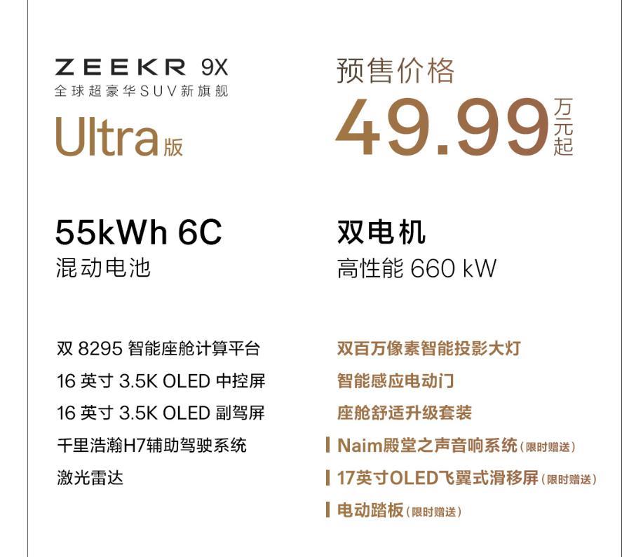 成都车展极氪9X预售,47.99万起,大家关注度挺高,也有一些疑问,整合一些官方回答,帮大家解答下。 1. 提供多种轮毂样式,星耀轮毂、镜面轮毂、曜黑轮毂,尺寸、价格和样式后续会提到。 2. 二三排配隐私玻璃,全车还有7个遮阳帘,注重用户隐私。(三排侧窗遮阳帘和后风挡遮阳帘只有Ultra和Hyper版配了。) 3. 全系标配二排双重力座椅,Ultra版在Max版升级了座椅舒适升级套装,Hyper版在Ultra版上,增加二排双旋转座椅和主驾靠背主动侧翼支撑。 4. 参与先享计划/支付预售意向金后,直至上市后锁单前,都可以更改配置,变更车主信息等,但禁止转单。 5. 9月中旬起,展车陆续到达全国门店,可以静态体验,9月下旬开放动态试驾。【来自懂车帝车友圈】