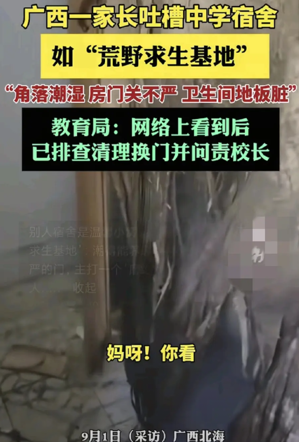 广西北海,有家长吐槽初中宿舍环境令人堪忧。宿舍门关不严,角落潮湿,卫生间的卫生不堪入目,视频发出来以后,当地有关部门已经立即派人到宿舍进行清理并安装好新的门而且还对校长问责,如果这种环境不被曝光,不知道还要多少届的学生要住下这样的宿舍。家长们称这样的宿舍真的是荒野求生之地,没有好的环境又怎么安心读书?不能能说要多么的奢华,但是最起码的整洁安全设施是学生们的保障。